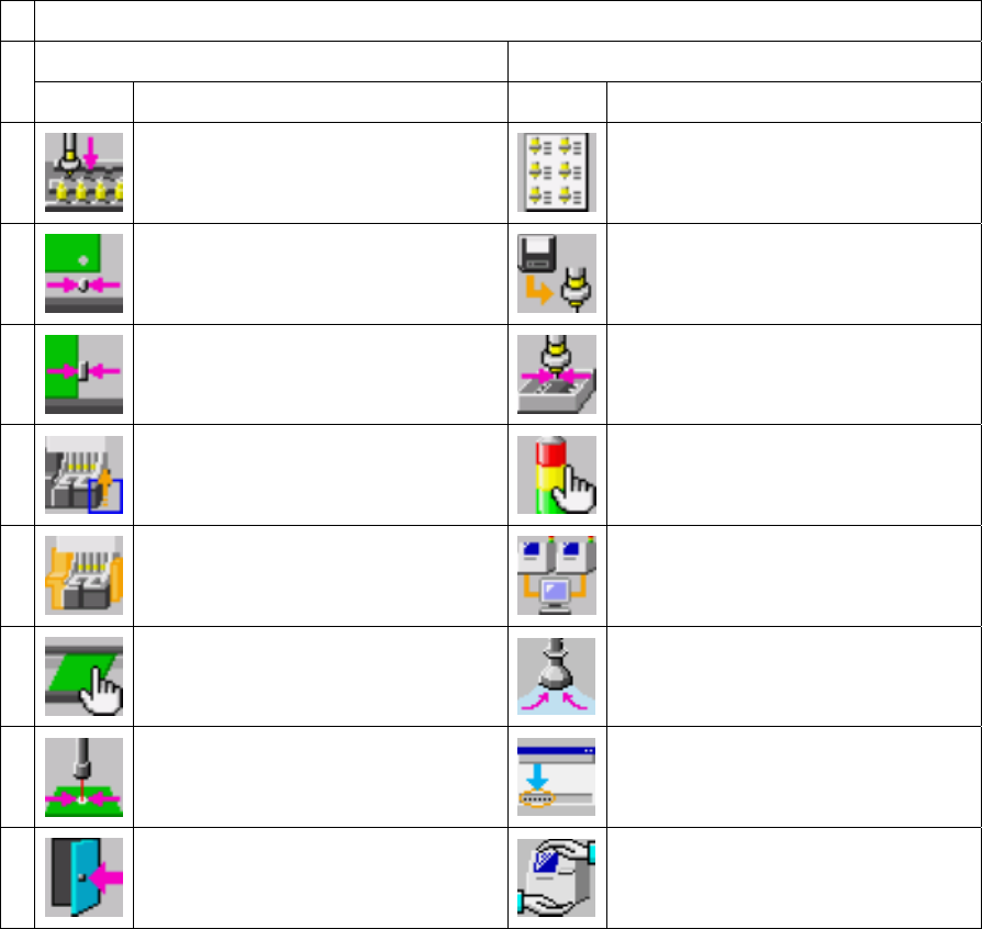 第3章 菜单和命令按钮 3.2.3 机器设置 机器设置画面上的各项命令按钮及处理功能,图示说明如下。 页 1/2 2/2 图标 名称和概要 图标 名称和概要 1 ATC 吸嘴配置 注册吸嘴一览 2 基准针位置 读入吸嘴数据 3 外形基准位置 元件废弃位置 4 贴片头待命位置 信号灯 5 使用单元 多工位生产线 设定与 HLC 的接续。 6 基板传送 无吸嘴时真空值 7 BM 读入器 进行坏板标记读入器示教。 状态栏 8 退出 返回桌面。…