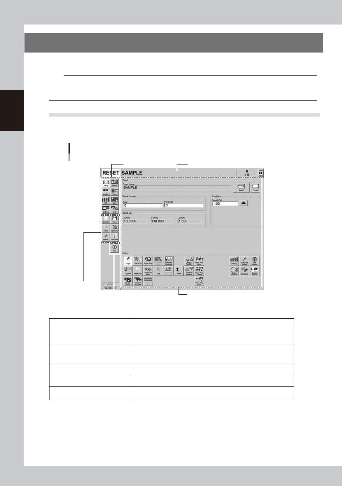 The operation screen consists of "Status area", "Main menu button area" and "Submenu button and parameter