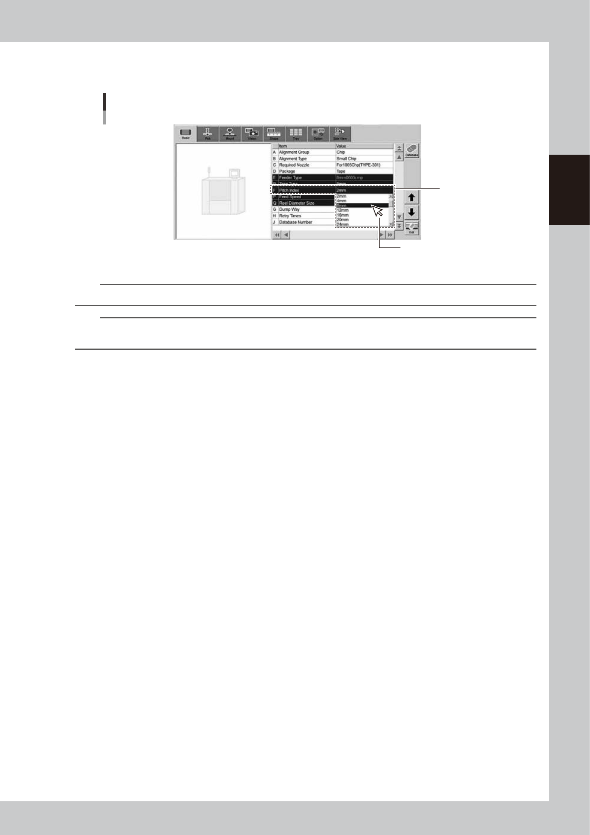 2-57 2 Basic operation 5 Specify “Pitch Index” . Drop down “F . Pitch Index” to select the feed pitch accor ding to the component tape to be used. Specifying the Pitch Index [Parts] - [Basic] tab F . Pitch Index Select f…
