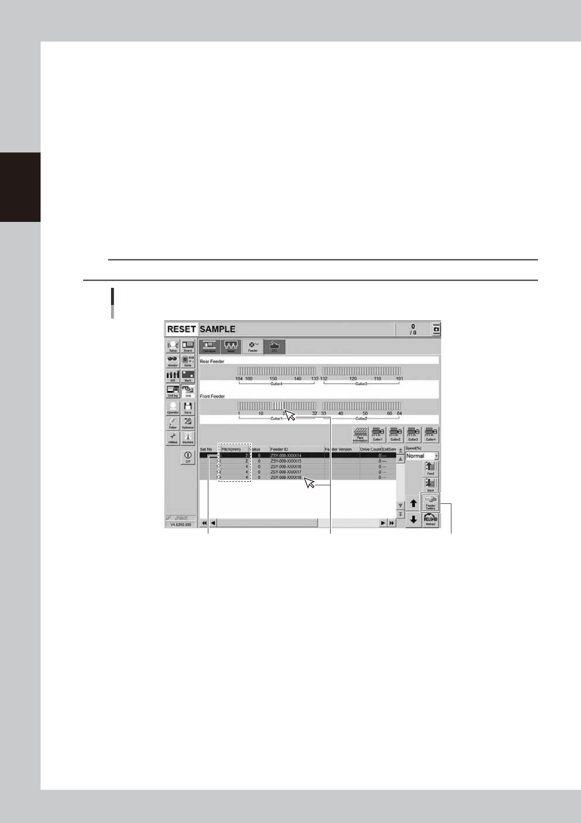 Select the feeder for which you want to set the feed pitch, and then press the [Feeder Setting] button