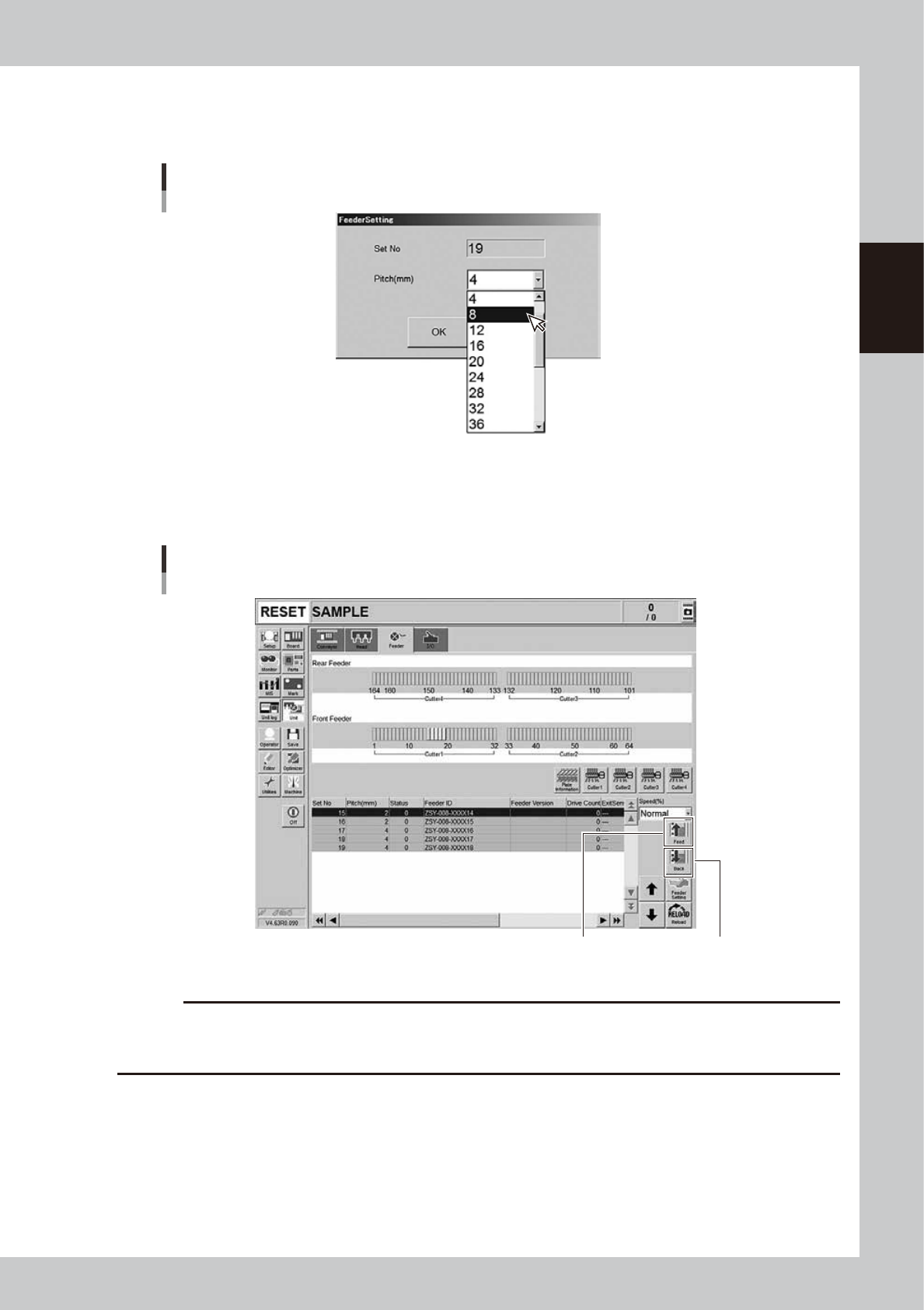 Drop down the “Feed Pitch” on the “Feeder Setting” screen to select the feed pitch. Then, press the