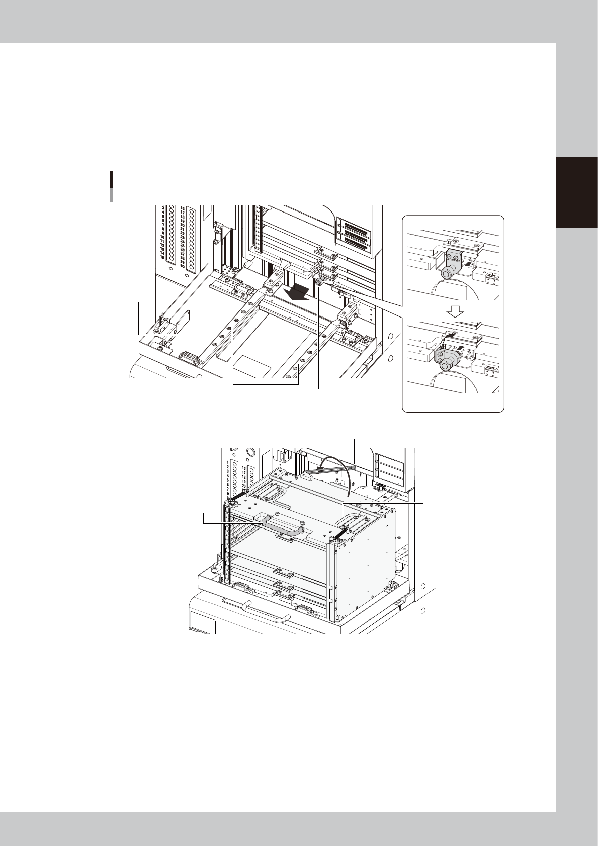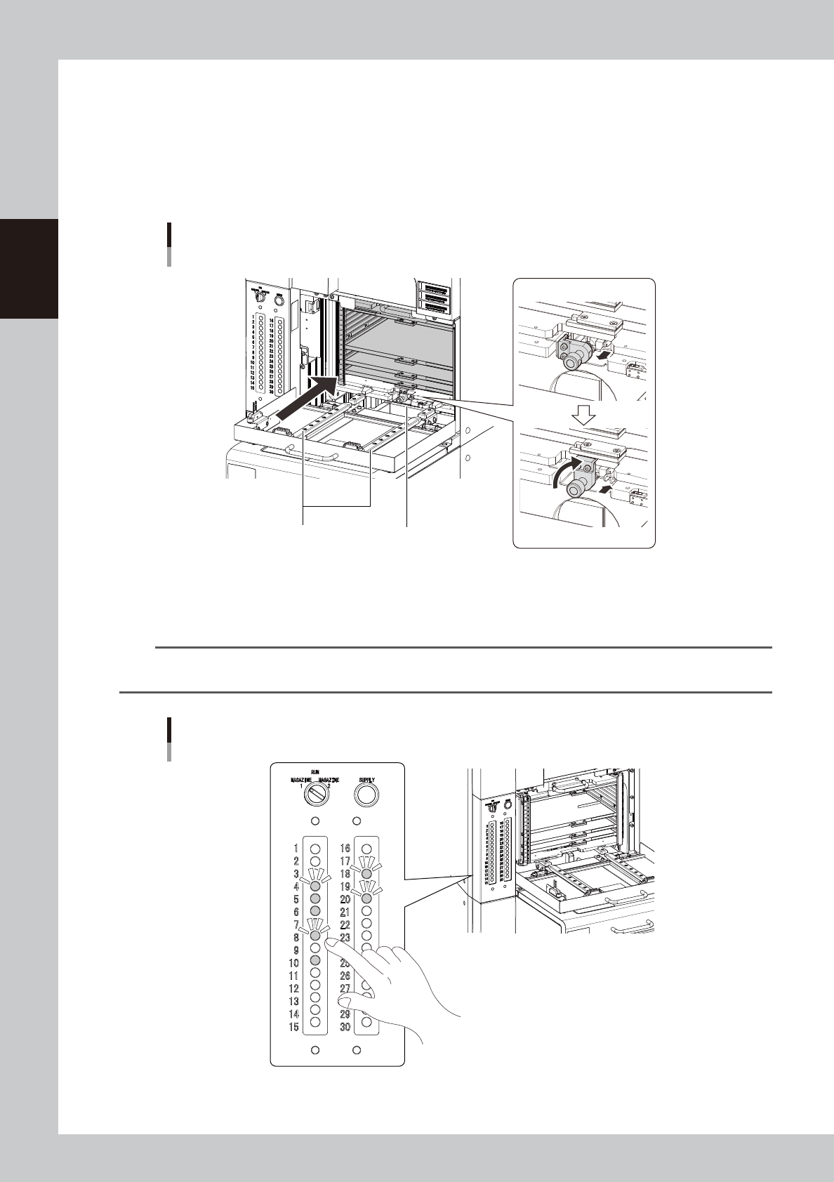 2-80 2 Basic operation 5 Set the new magazine. 1. Temporarily put the magazine containing components supplied with aligning the bottom groove with the guide. 2. Put the pallet retainer rod into the magazine top. 3. Hold …