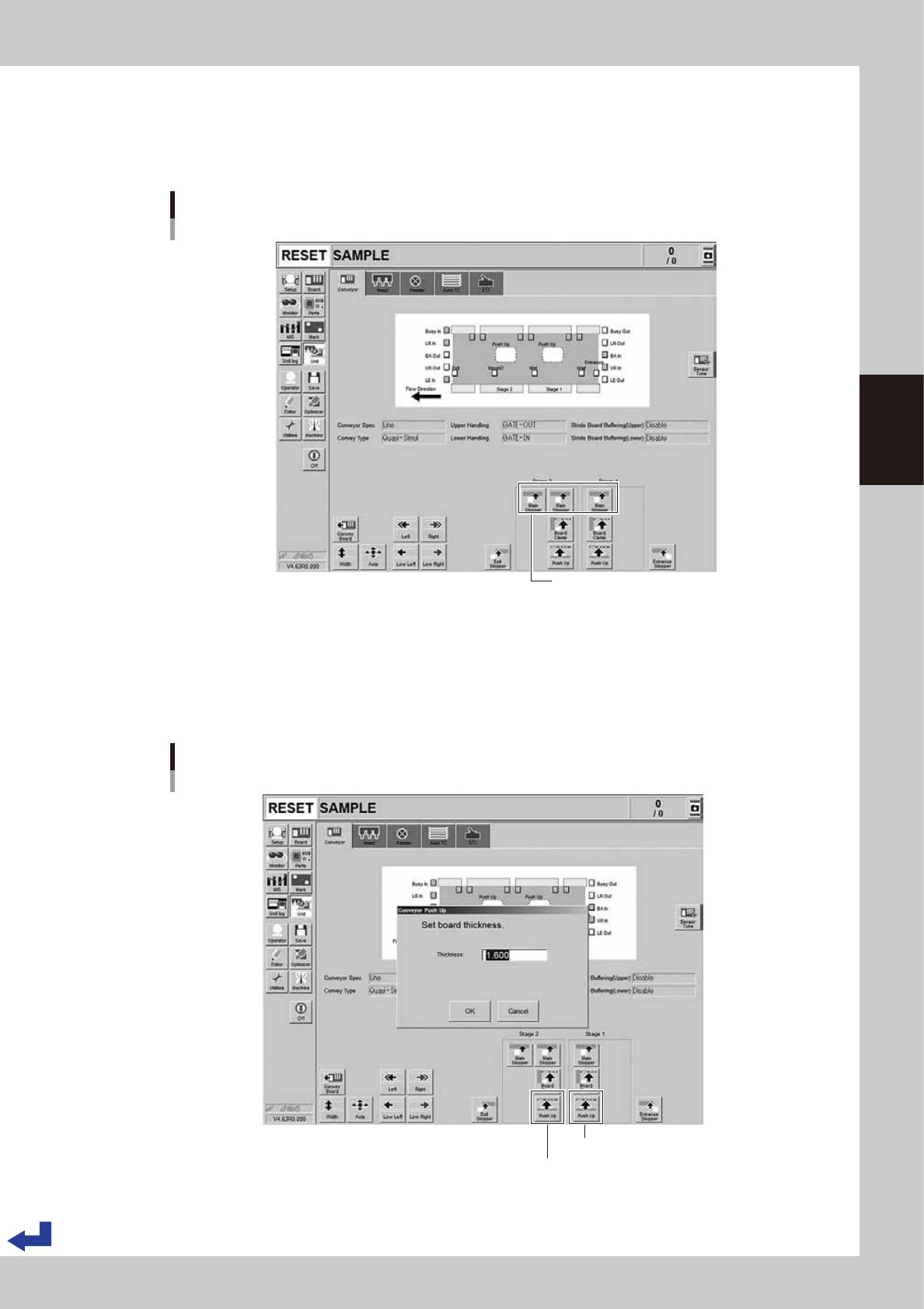 Press the [Main Stopper] button on the “Unit” – “Conveyor” screen to lift the main stopper.