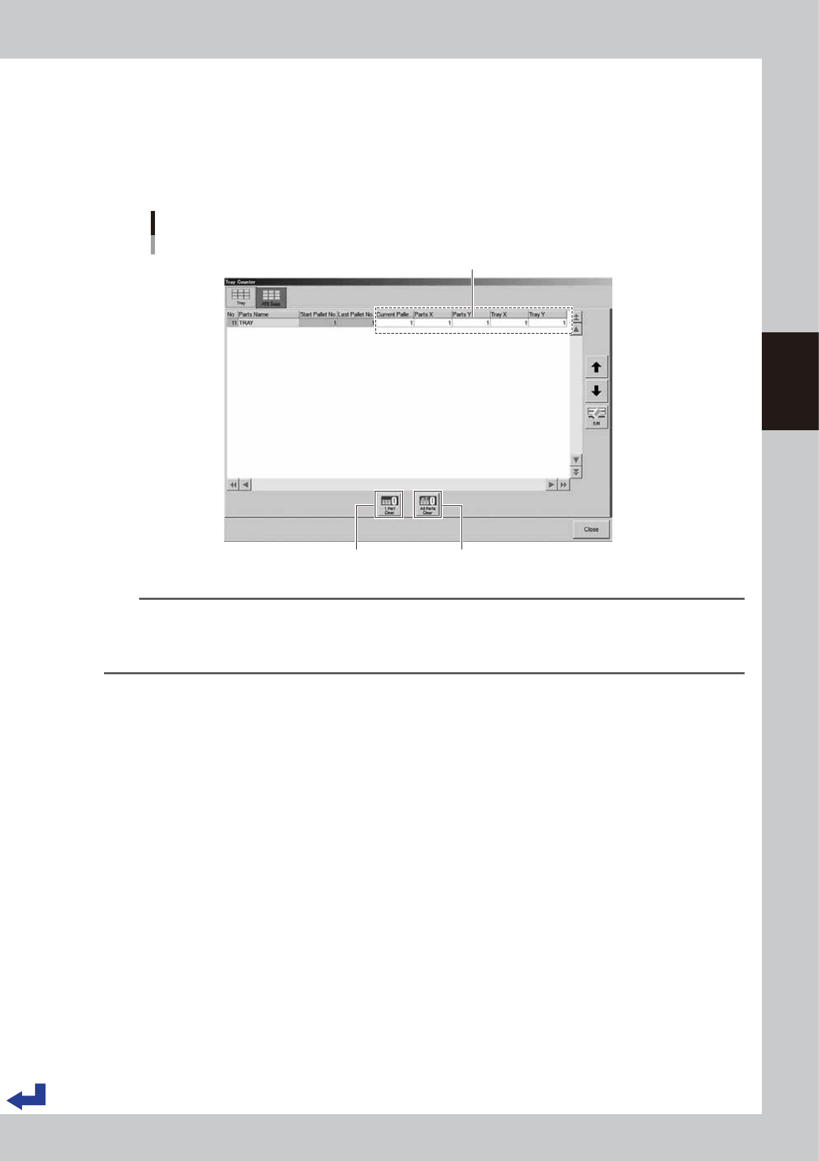 Pressing [All Parts Clear] button resets the parameters of all the components on the “Tray Counter” screen, same as