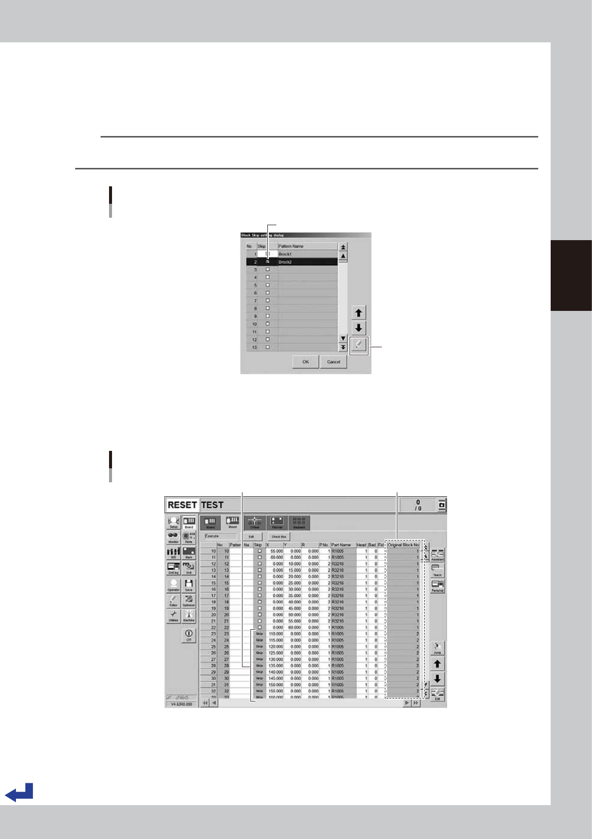 The block data designated to be skipped can be checked on the “Board” – “Mount” screen.