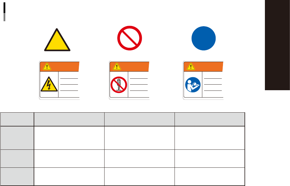 The following 3 types of marks are used on warning labels. Each mark has its own meaning and is typically