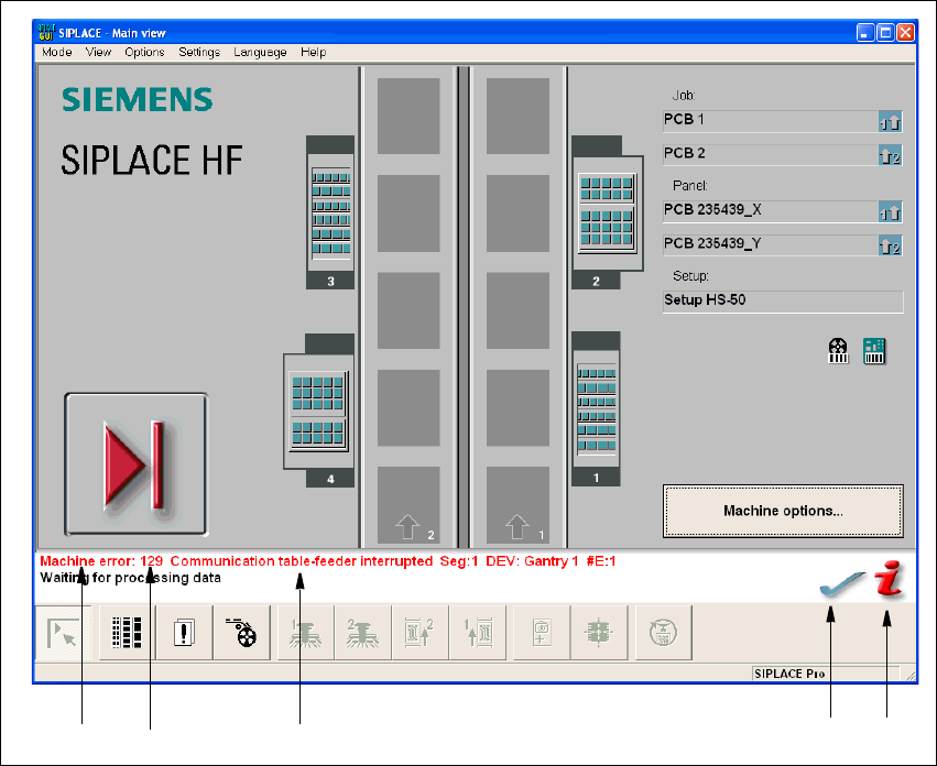 5 Error information SIPLACE Softw are Guide SR.504.xx 5.2 Calling error information Issue 01/03 EN 56 5 Fig. 5.2 - 1 Main view with error message ) Key to Fig. 5.2 - 1 (1) T ype o f error (T rack, machin e, tran sport or…