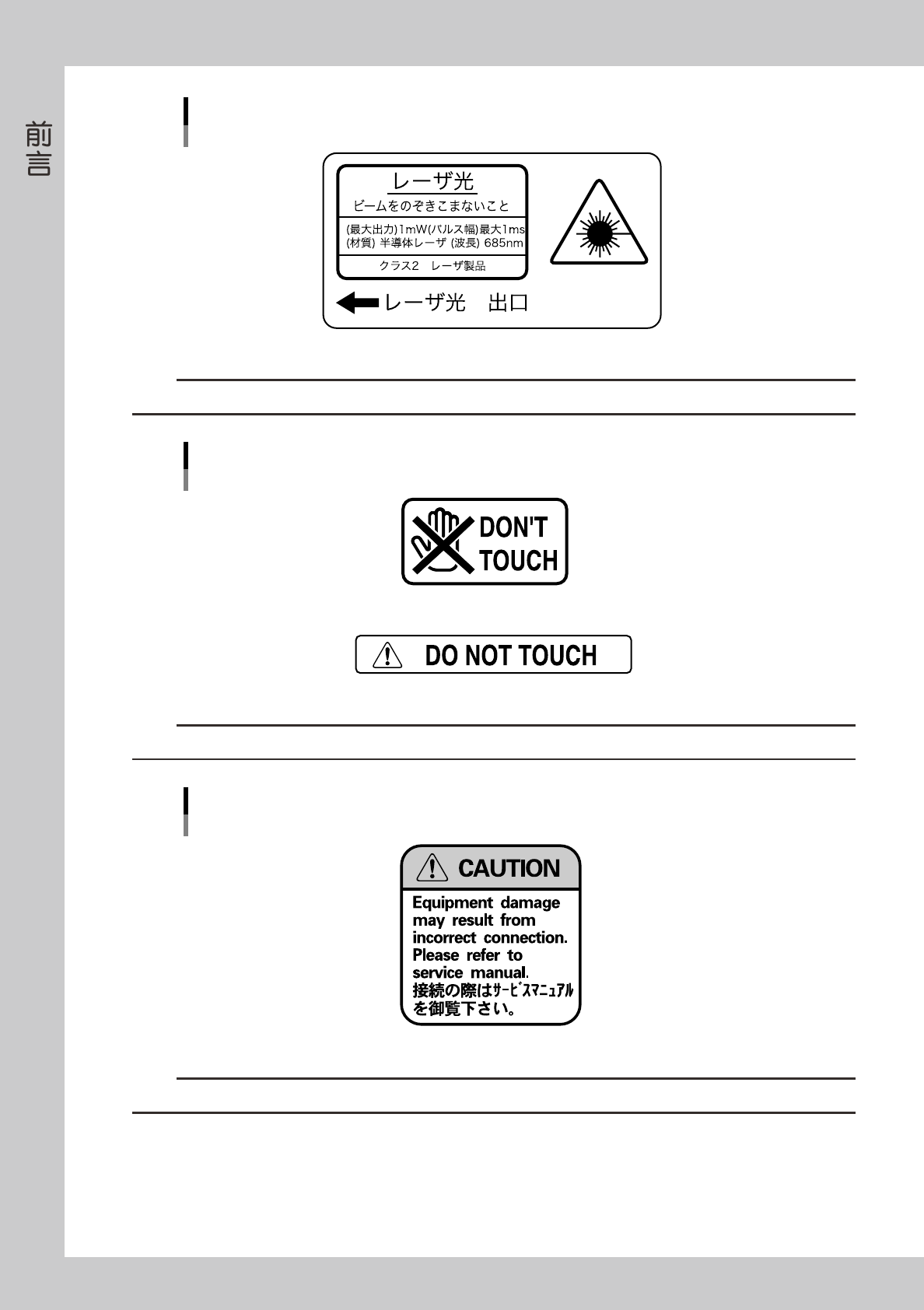 vii 有受伤的危险 22 0 0 1- G 0 -0 S w 警告 更换送料器必须由接受过安全教育和正确操作机器的培训课程的人员进行。 高圧注意 有触电的危险 22 0 0 1- G 0 -1 C c 注意 触摸机罩内的电源部,会有触电的危险。 高温注意 有烫伤的危险 22 0 0 1- G 0 -1 D c 注意 可动部的马达处于高温状态,切勿触摸。