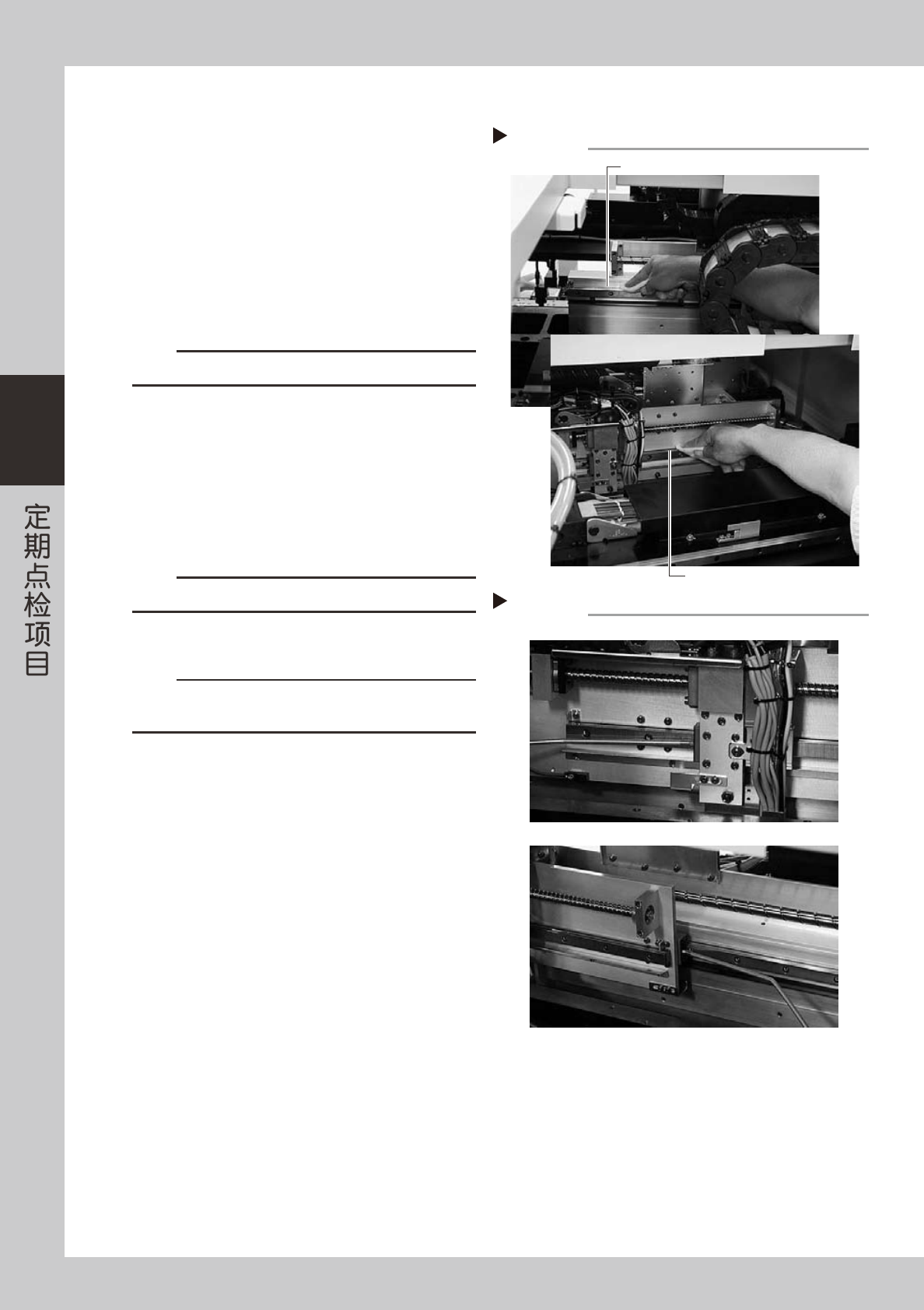 3-16 3 2 . 7 . 2 T 轴 线 性 导 轨 的 清 洁 · 加 油 1 取 下 外 罩 。 ( 2 个 ) 用 六 角 扳 手 卸 下 固 定 外 罩 的 螺 栓 。 ( 6 个 ) e 2 按 紧 急 停 机 按 钮 。 为 安 全 作 业 , 务 必 使 机 器 处 于 紧 急 停 机 状 态 。 3 擦 拭 T 轴 线 性 导 轨 。 用 无 尘 纸 ( 清 洁 室 用 ) 等 擦 拭 线 性 导 轨 全 轨 。…