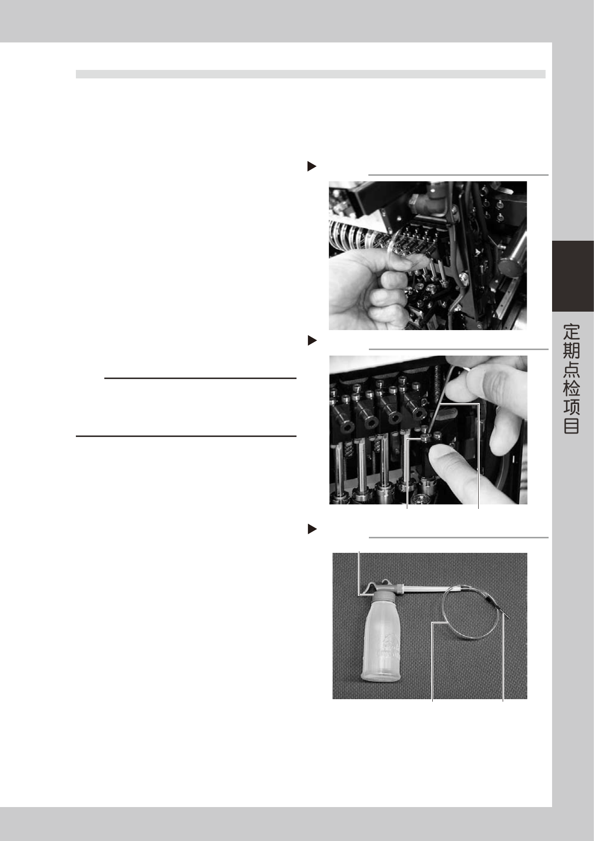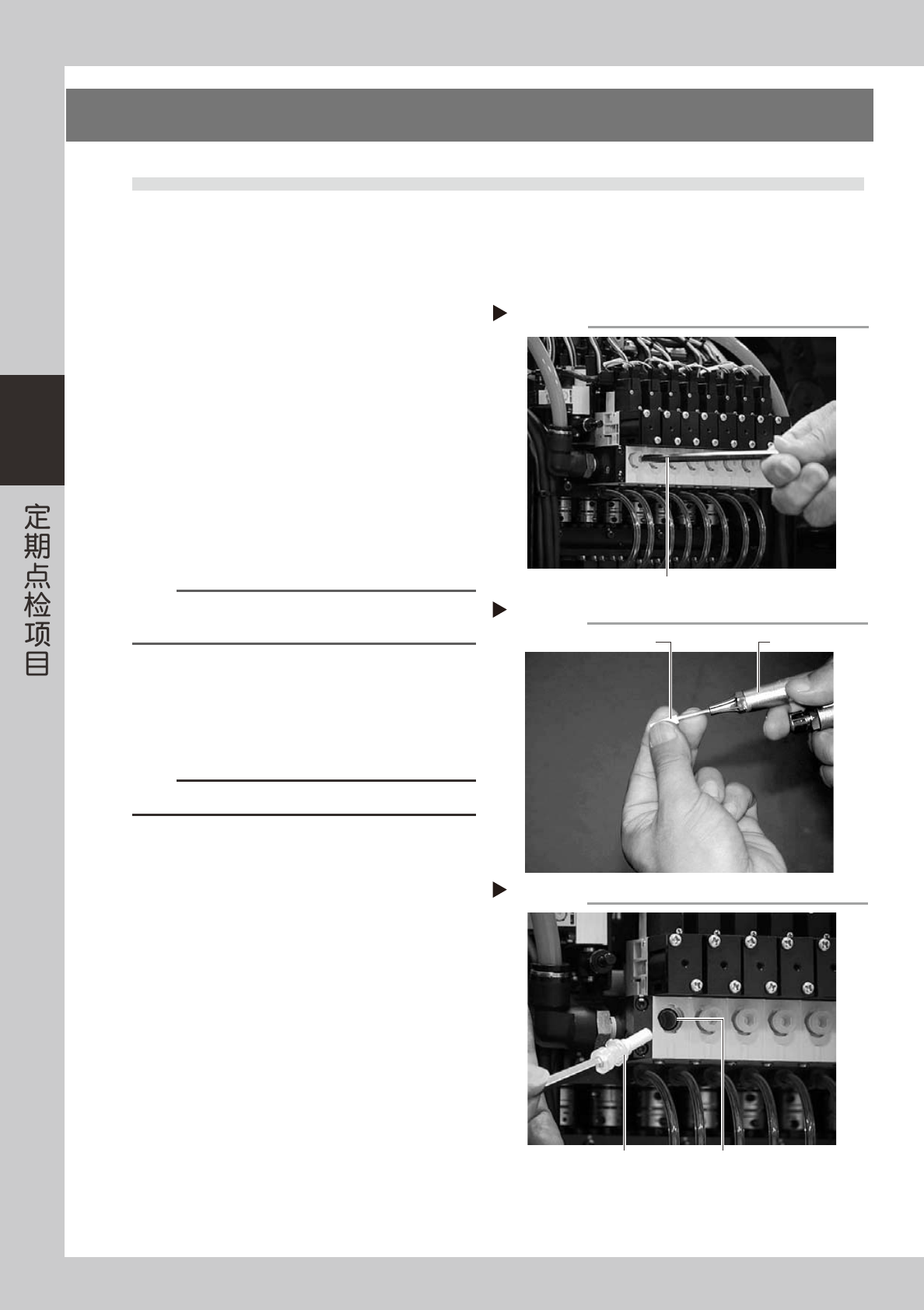 3-23 3 3 . 2 多 槽 轴 内 的 清 洁 · 加 油 虽 然 供 气 状 态 和 实 际 运 作 时 间 各 异 , 但 一 般 3 个 月 左 右 必 须 对 多 槽 轴 内 部 实 施 一 次 清 洁 作 业 。 因 为 多 槽 轴 的 空 气 通 道 内 如 有 异 物 粘 附 或 污 垢 残 留 , 会 导 致 吸 附 · 贴 装 错 误 的 发 生 。 3 . 2 . 1 多 槽 轴 内 的 清 洗 1 拆…