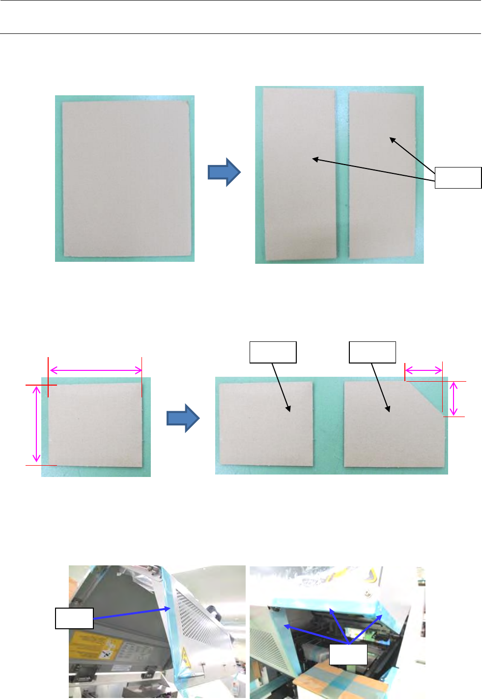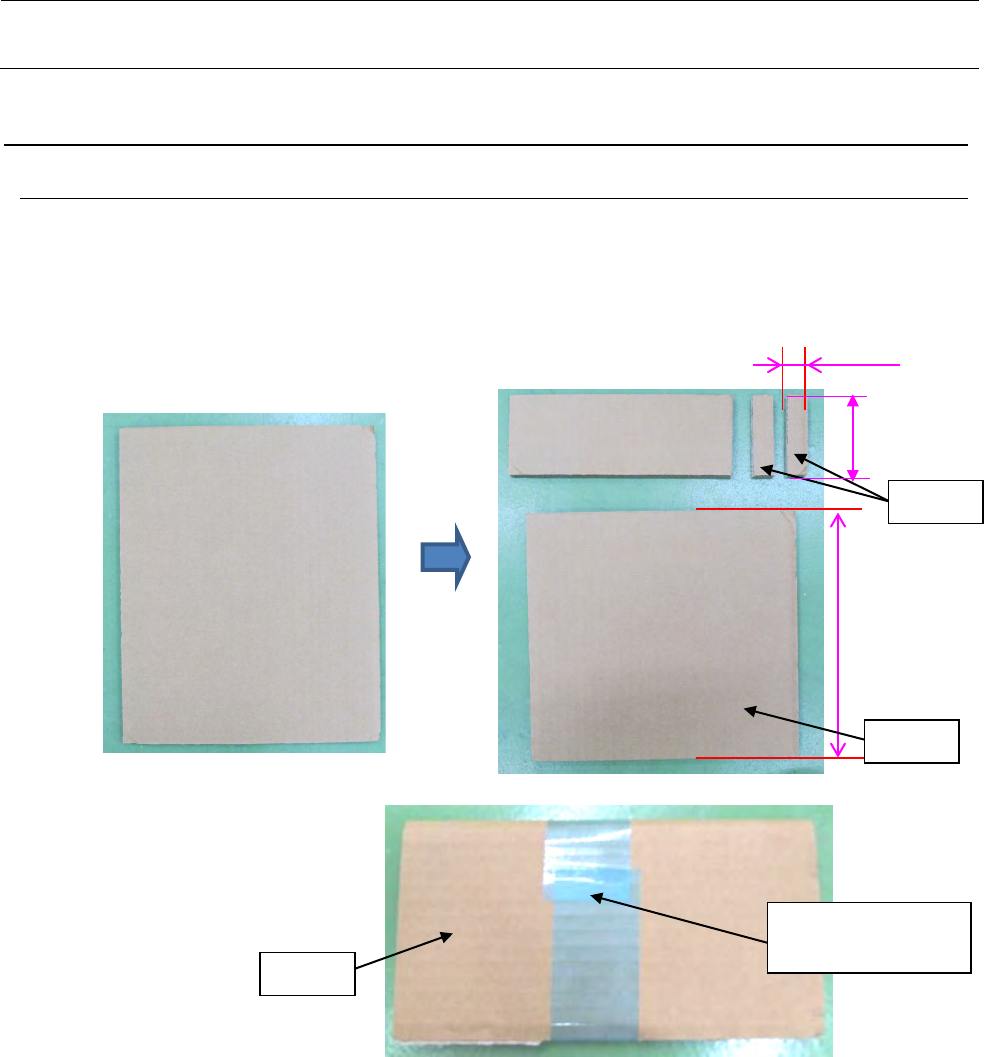 包装要领书 8 -1 第 8 章 安 全防护罩 8- 1 安全防 护 罩 ① 请 按如下方式将 纸板作 为 安全盖 的保 护部件进行 切割。 和部件 A , B 40044469 :准 备 两个 LCD GUARD 。 切成所示的形状。 部件 A 胶粘在沿着 眼睛 纸板的中心折 叠。 200mm×2 個 30mm×2 個 纸板 A 在中心折叠 瓦楞卡 A 并用胶 带固定 。 纸板 A 纸板 B 8 0mm ×2 個
