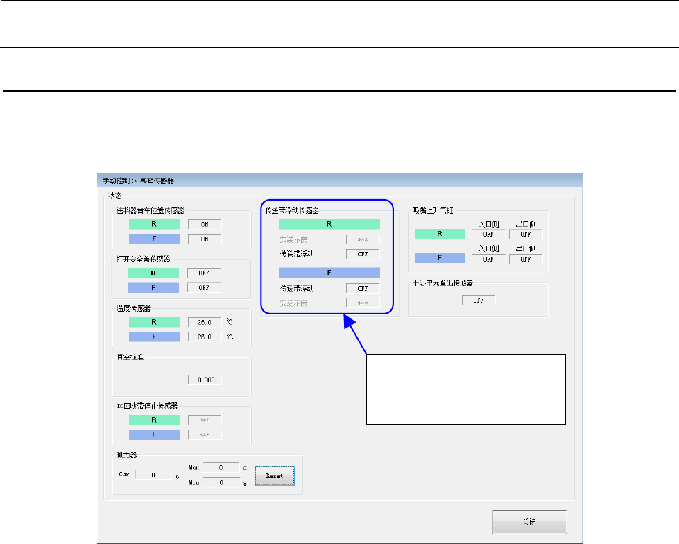 请向手动控制>其他>其它传感器 转移,使用 ETF8S 和 ETF8D 进行以下作业,以检查后侧传送带