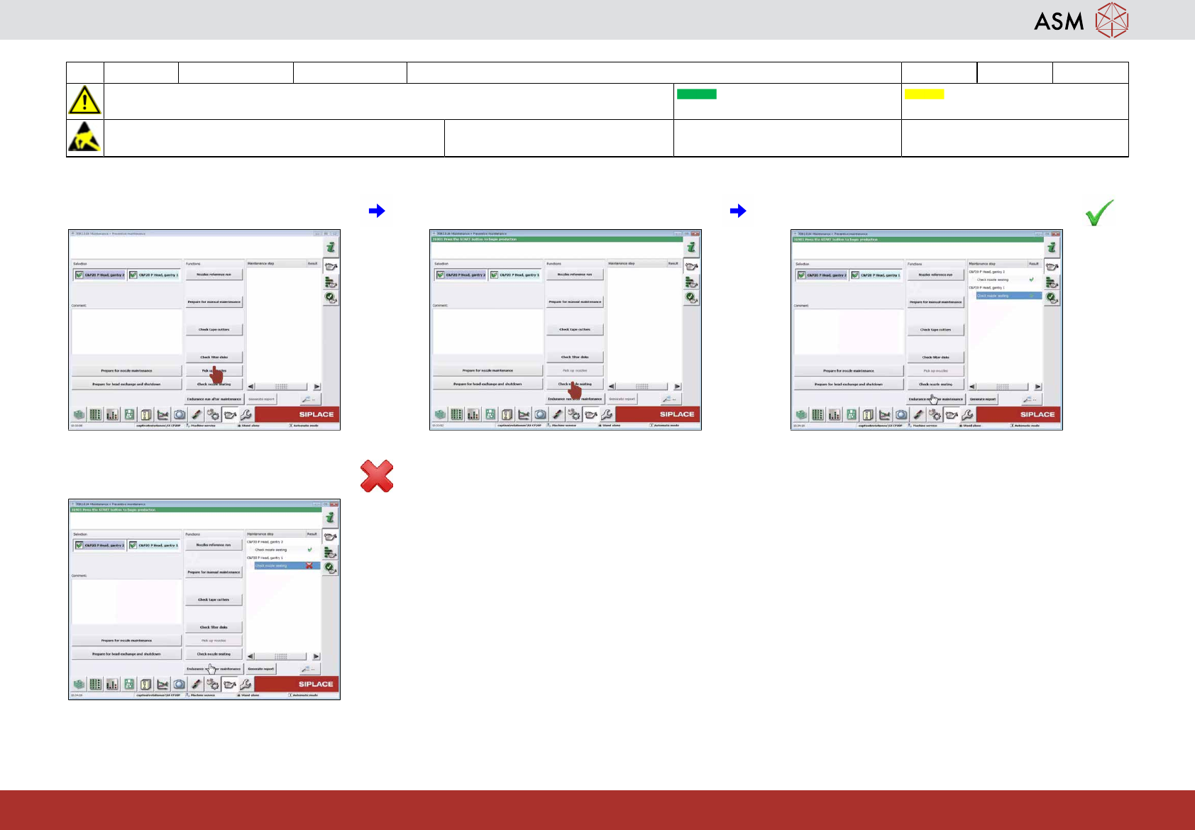 1 Click on "Pick up nozzles". 2 Click on "Check nozzles seating". 3 Check if result OK (green hook).