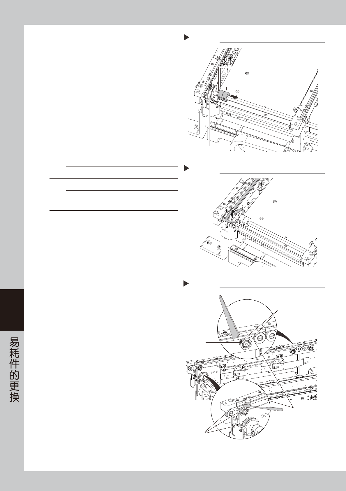 6-7 6 8 安装新的传送带。 1. 将新的传送带挂在施加张力的带轮上。 2. 再将传送带挂在 Step4 中拆卸的带轮上并用垫 圈、带轮轴固定。 3. 将联轴器连接到驱动用带轮上并固定。 4. 将在 Step4 中移到长孔最边端的带轮移回在 Step3 中作记号的位置并固定。 5. 若传送带有松弛,可调整施加张力的带轮的位 置加大张力。 n 要点 本机传送带的张力规格如下。请根据需要使用张力计调节。 ‧ 输送台 1 : 260 〜 …