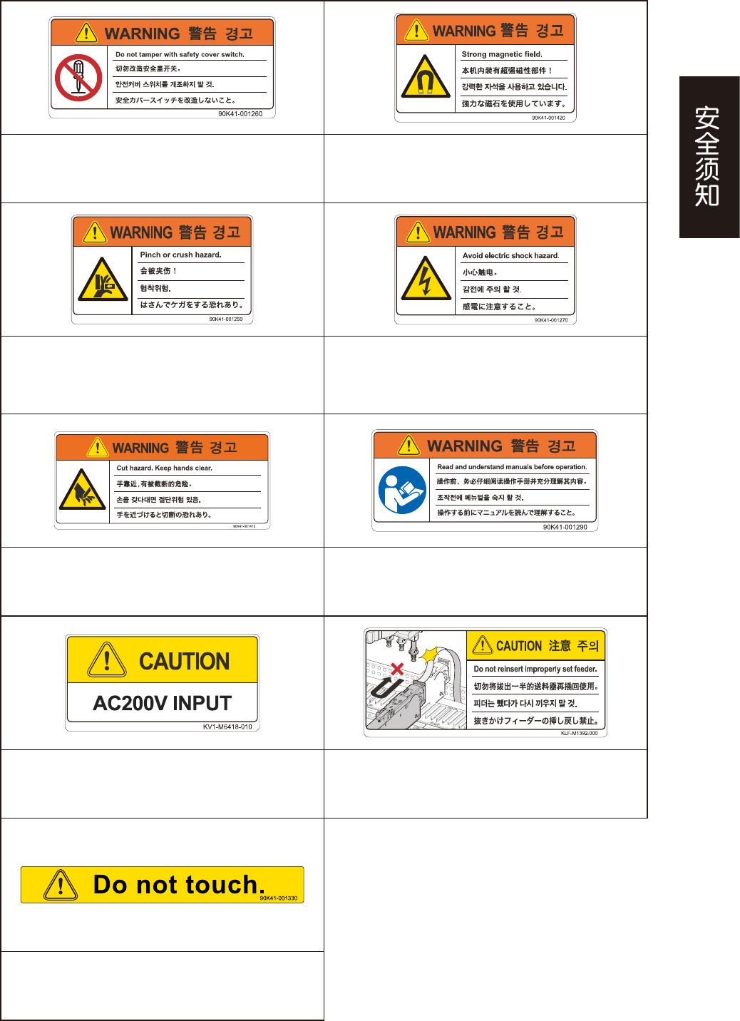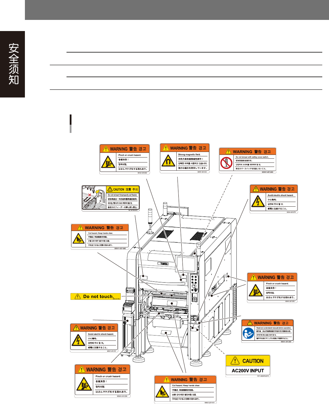 为了安全使用设备,如下图所示,在设备各个部位张贴了警告标贴,务必严格遵守标贴指示。此外,关于本节所