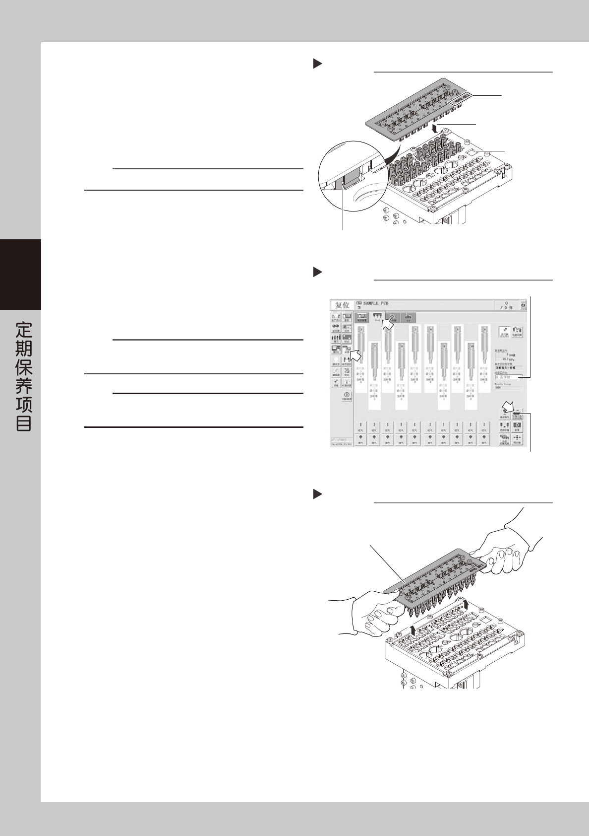 3-7 3 1.2.4 ANC 吸嘴装卸工具的使用方法 选配有吸嘴交换站 ( 以下简称“ANC”) 的贴片机,在进行维护保养时,需要用手将吸嘴从吸嘴交换站中拆出。 拆出时,若使用“ANC 吸嘴装卸工具”( 以下简称“装卸工具”),可以一次性拆出或放回最多 40 个吸嘴。 ANC 吸嘴装卸工具有 MU 贴装头单元用与 RS 贴装头单元用 2 种。 下面,介绍使用装卸工具拆出与放回吸嘴的方法。 ■ MU 贴装头用 ANC 吸嘴装卸工具 未装…