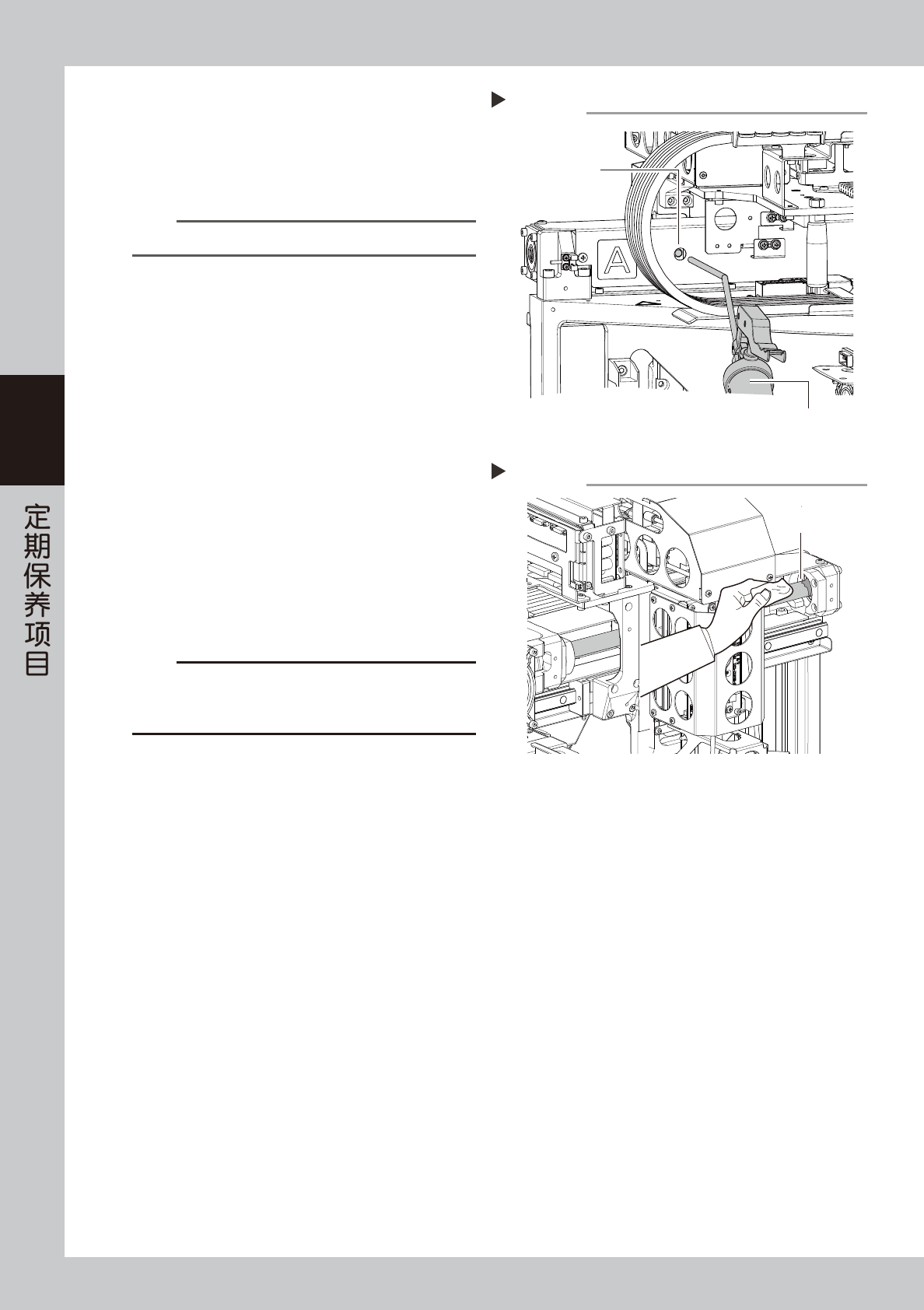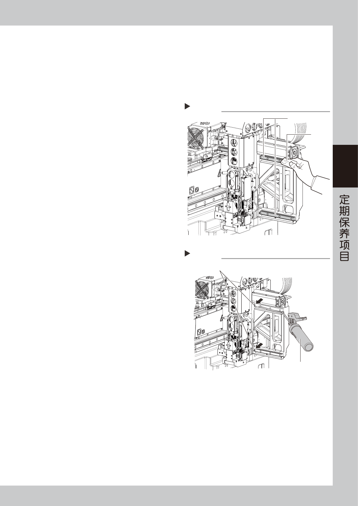3-16 3 4 加润滑油。 1. 如右图所示,用手将贴装头移至可以从插入口 看见润滑油注油嘴的位置。 2. 用润滑油枪 (30°弯折型枪嘴 ) 将指定的润滑油 从润滑油注油嘴注入。 n 要点 注入润滑油,直至注入的干净润滑油从缝隙间溢出为止。 5 擦去多余的润滑油。 1. 将贴装头单元移到一端。 2. 擦去滚珠丝杆与滚珠丝杆端面多余的润滑油。 3. 再将贴装头单元移到另一端,擦去滚珠丝杆另 一端及其端面多余的润滑油。 6 进行暖机运行…