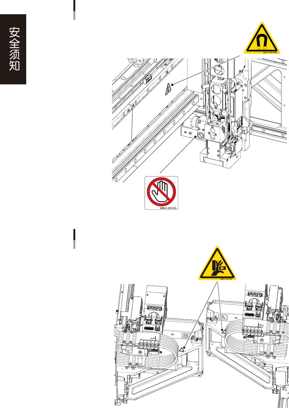 vii 设备的可动部碰触身体,会有受伤的危险。 可能会导致死亡、受伤或使设备发生故障。 请勿随意触摸、改造机盖开关。请勿在解除机盖开关的状态下运行 设备。 请务必充分理解有关强磁场的注意事项。 ‧ 手有被可动部与盖板夹伤的危险。 ‧ 手或手指有被可动部夹伤的危险。 有触电的危险。 设备运行过程中或操作载料箱时,请勿将手等伸入设备内部。 请勿用手触摸盖板内的电源部。 有被料带切刀割伤的危险。 载带与贴装头接触,可能会导致设备被损坏。 在接…