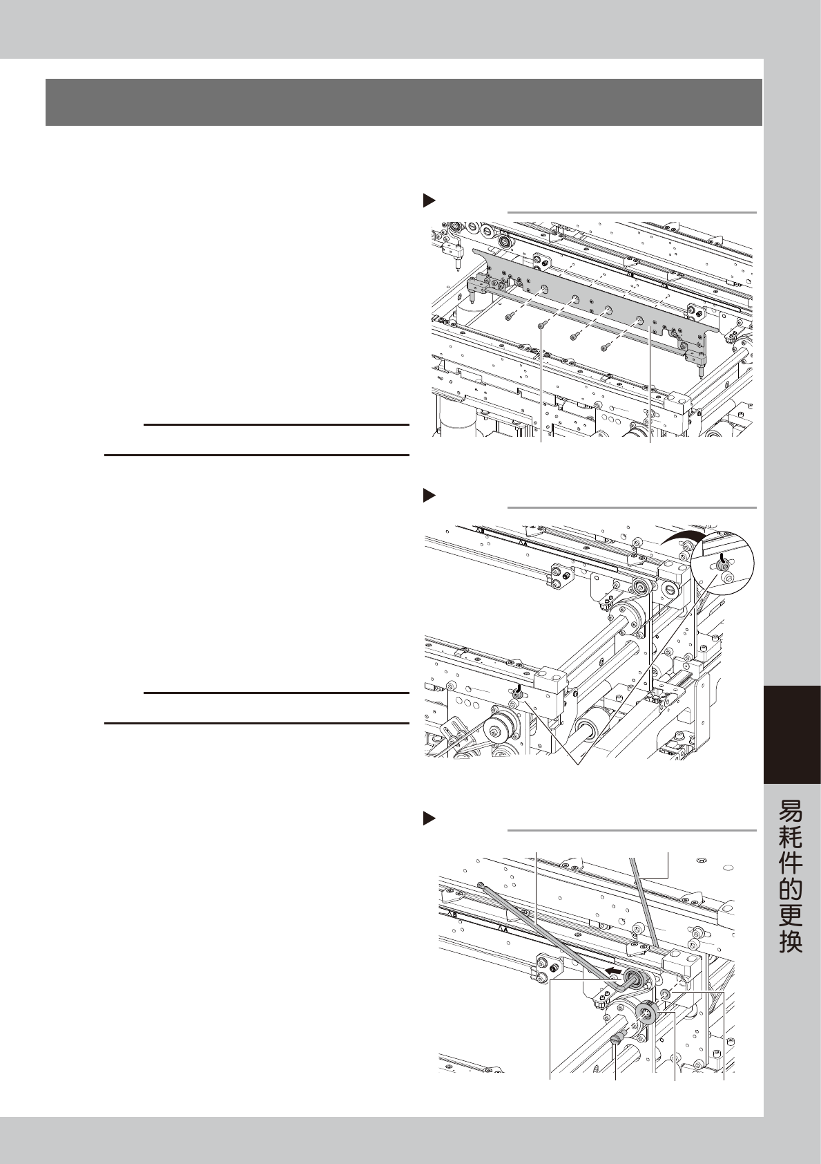 6-6 6 5 使联轴器与驱动传送带的带轮分离。 1. 用内六角扳手 (2.5) 拧松联轴器部的螺栓。 2. 使联轴器与驱动用带轮分离,以便使传送带可 以从空出的缝隙中取出。 6 将传送带取出。 将传送带从联轴器与驱动传送带的带轮之间空出的 空隙中取出。 7 清洁传送带导轨部与带轮。 1. 用吸尘工具 ( 选购件 ) 清除传送带导轨与传感 器等部位粘附的传送带磨损粉。 2. 带轮表面若有传送带的磨损粉变黑固着时,可 用塑料刮片等除去。 …