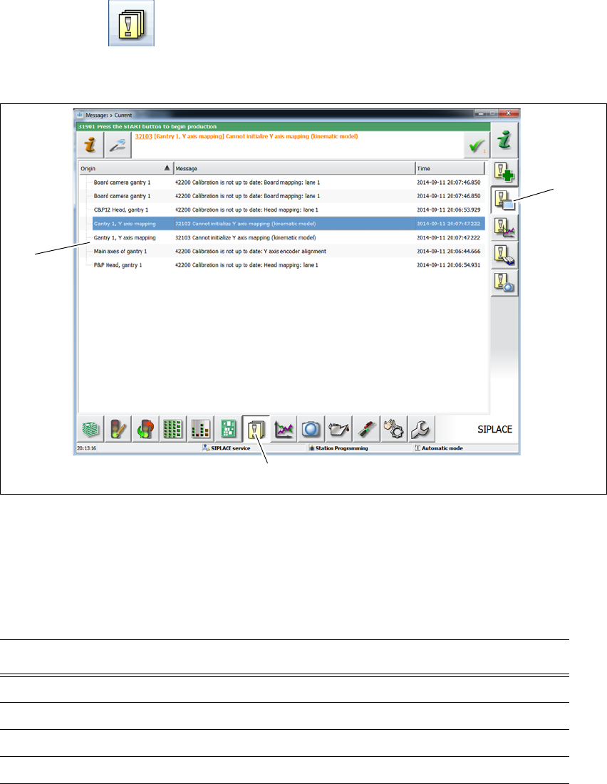 5 Working with the machine User manual SIPLACE E 5.7 Messages and online help From software version SC 708.0 05/2 015 Edition 216 5.7.2 Viewing info rmation about current and past messages Click on the button in the to…