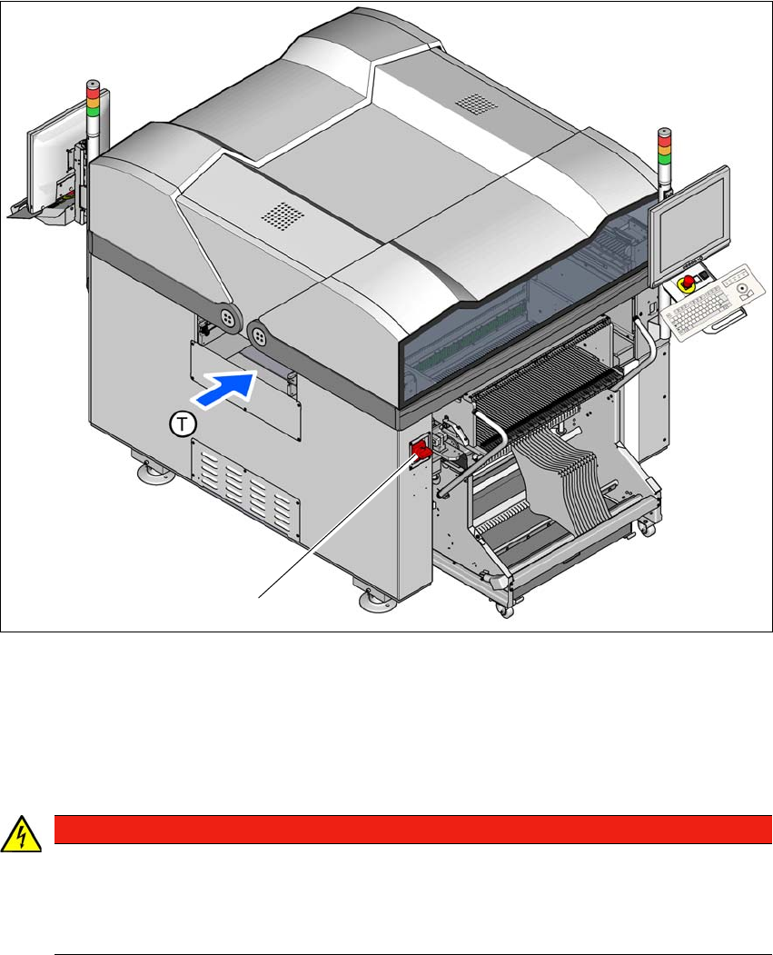 2 Operational safety User manual SIPLACE E 2.8 Residual voltages and discharge times in the machine From so ftware version SC 708.0 05/2015 Edition 88 2 Fig. 2.8 - 1 Position of the main power switch (1) Main power switc…