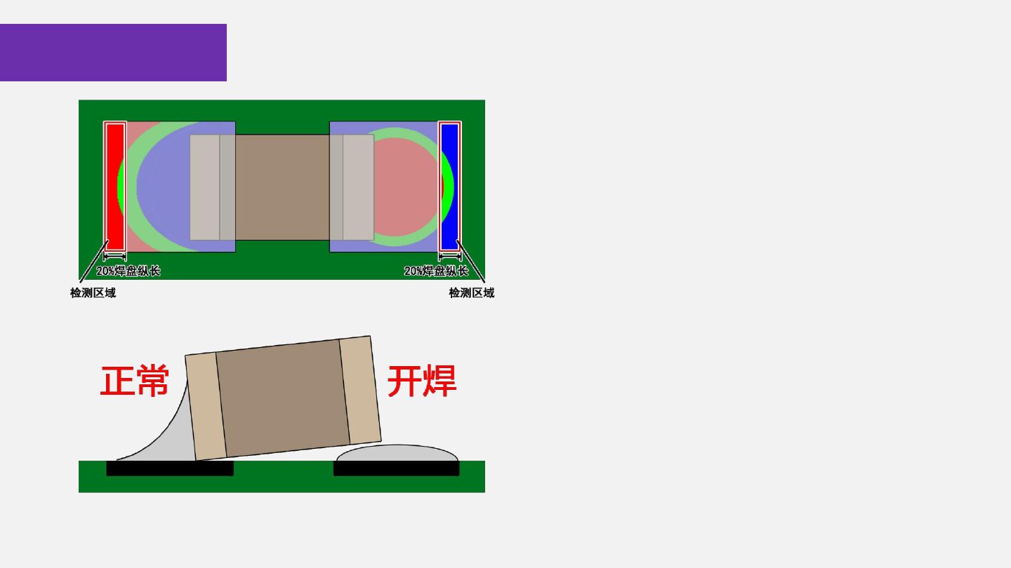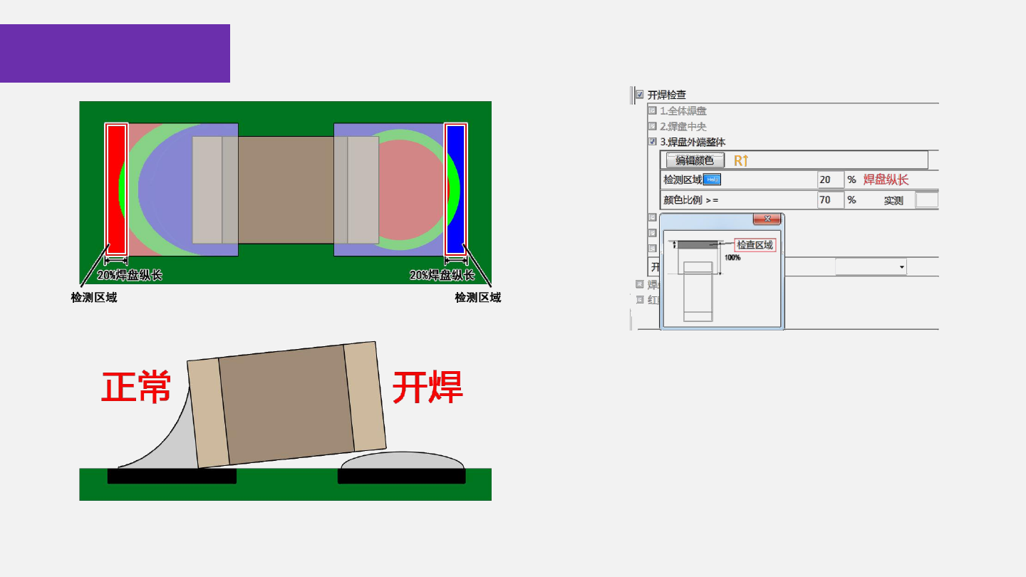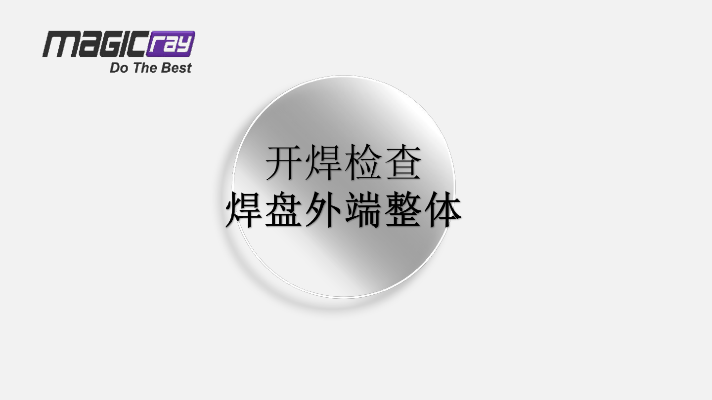 MagicRay technology | Chip 算法原 理 Chip 开焊检查 -- 焊盘外端整体 (3) 开焊特征:焊 盘外端,大 量蓝色 ③焊盘外端整 体:检测区 域为上锡正常 时焊盘爬锡外 端较平缓的 区域。 (针对焊盘较 长的焊盘) 正常上锡时 ,此区域是爬锡末端的 平缓 区域,正常 上锡时此区域锡量较少 ,形成较平 的锡面,所 以在AOI成像呈 现大量红色。 开焊时,焊 盘上形成了水珠状锡膏 ,外 端整体为水 珠状锡膏的…