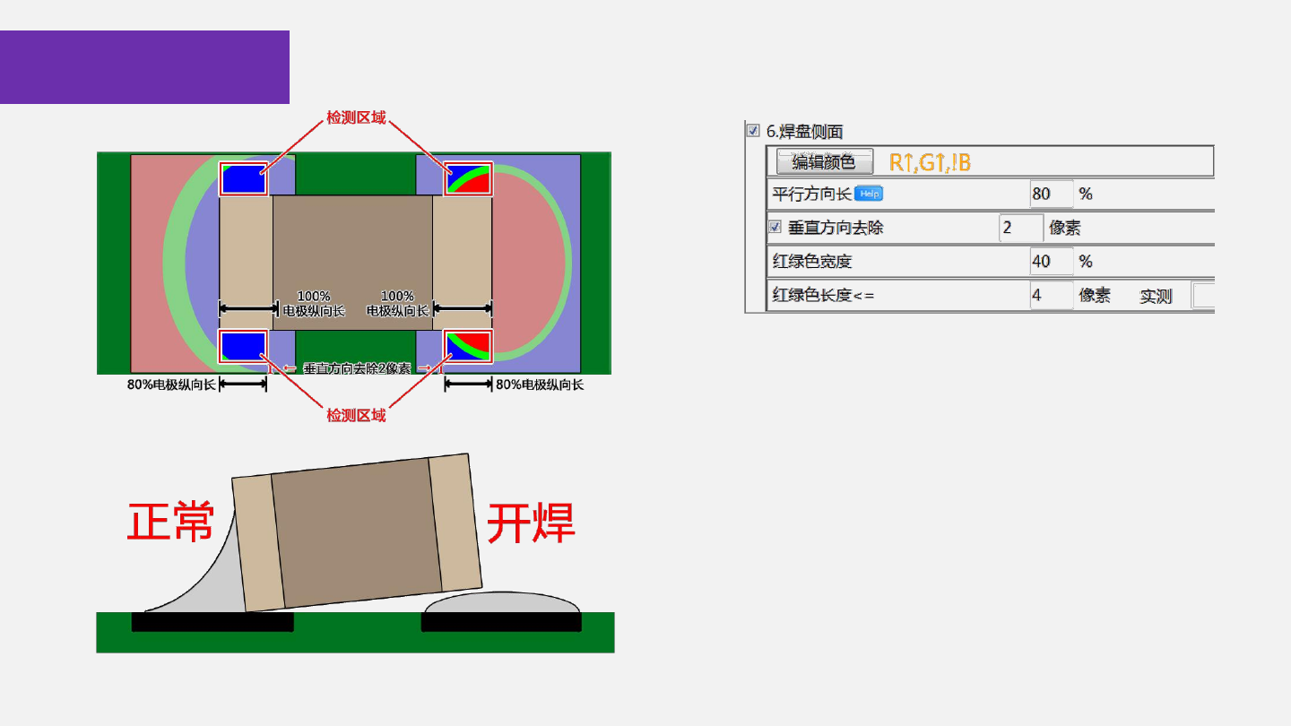 MagicRay technology | Chip 算法原 理 Chip 开焊检查 -- 焊盘侧面 (6) ⑥焊盘侧面 :检测区域为 正常上锡时宽 焊盘的侧面 爬锡区域。 (针对宽焊盘 ) 检查区域: 分别从电极两 侧往外生成两 个检索区域 进行检查焊 盘侧面。 连续长度≤正 常时该检测区 域内的红绿 色不允许超过 的数值。