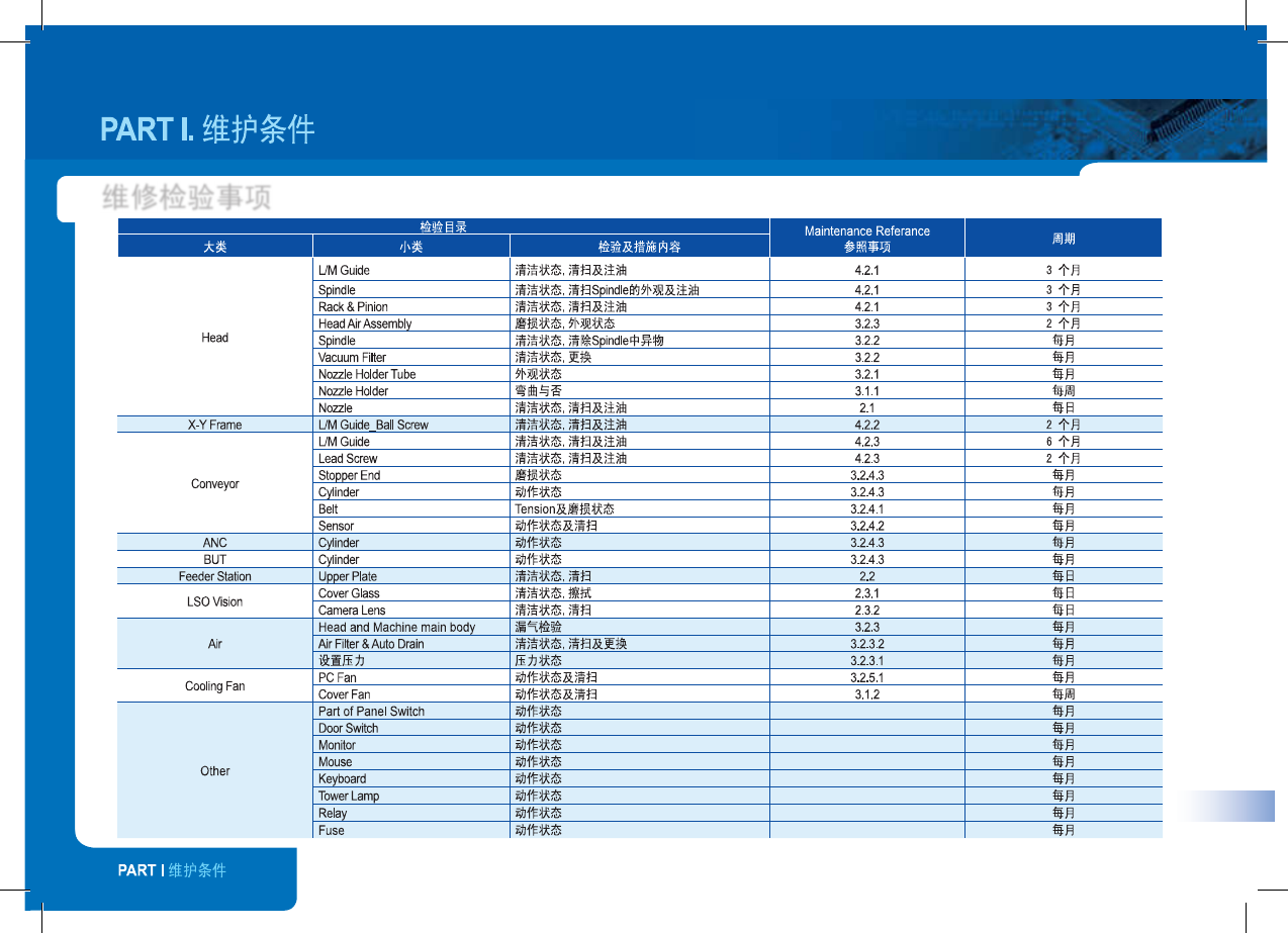 SM 3 10 M ai nte na nc e Ha nd bo ok 13 维修检验事项 PARTI . 维护条件 Maintenance Referance 参照事项 周期 检验及措施内容 清洁状态 , 清扫及注油 3 个月 L / M Guide 4.2 . 1 3 个月 清洁状态 , 清扫 Spindle 的外观及注油 Spindle 4.2 . 1 清洁状态 , 清扫及注油 3 个月 Rack & Pinion 4.…