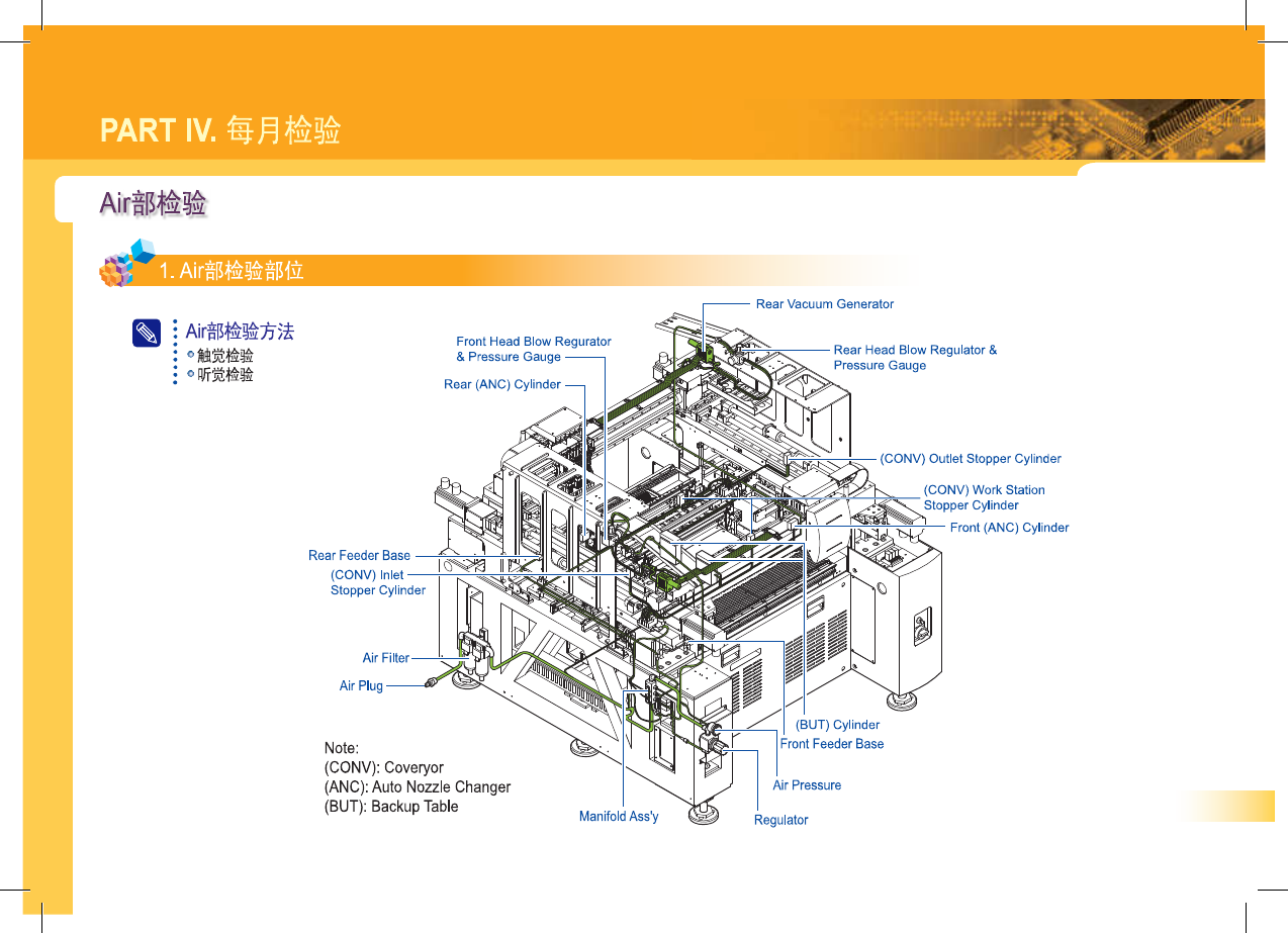 SM 3 10 M ain te na nc e Ha nd bo ok 34 PART IV . 每月检验 Air 部检验 VV : 1 . Air 部检验部位 Rear Vacuum Generator 驪 Air 部检验方法 ^ 触觉检验 ° 听觉检验 Front Head Blow Regurator & Pressure Gauge Rear Head Blow Regulator & Pressure Gau…