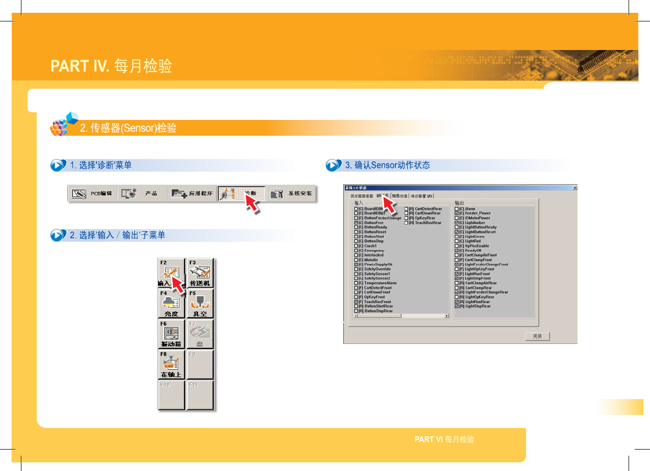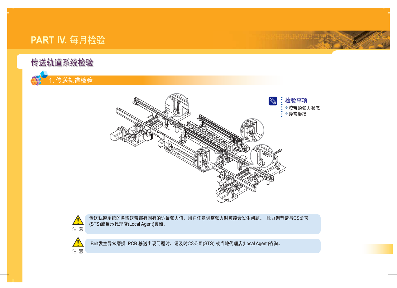 SM 3 10 M ain te na nc e Ha nd bo ok 44 PART IV . 每月检验 传送轨道系统检验 . 传送轨道检验 | * 检 验 事 项 : 。 胶带的张力状态 C 异常磨损 A 传送轨道系统的各输送带都有固有的适当张力值 。 用户任意调整张力时可能会发生问题 。 张力调节请与 cs 公司 ( STS ) 或当地代理店 ( Local Agent ) 咨询 。 注意 A Belt 发生异常磨损 , PCB…