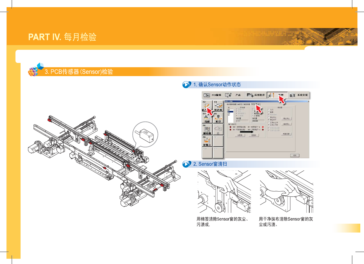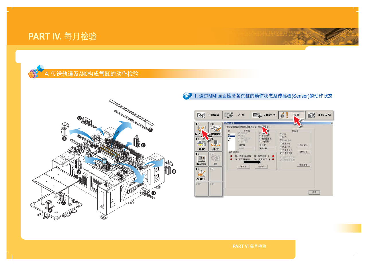 SM 3 10 M ain te na nc e Ha nd bo ok 47 C E A A B C D B D PART IV . 每月检验 ^ 4 . 传送轨道及 ANC 构成气缸的动作检验 通过 MIVH 画面检验各汽缸的动作状态及传感器 ( Sensor ) 的动作状态 1 . 应用程序秦 ' : 國 m PCB 编辑 产品 论断 系统安装 鰱 开讀 M F ; fifiS - 编 w « r 入口 r UK &qu…