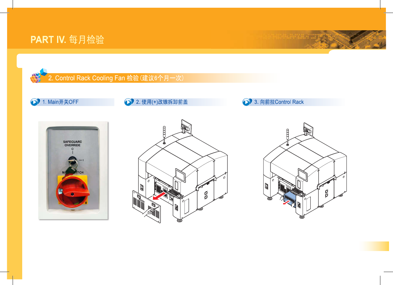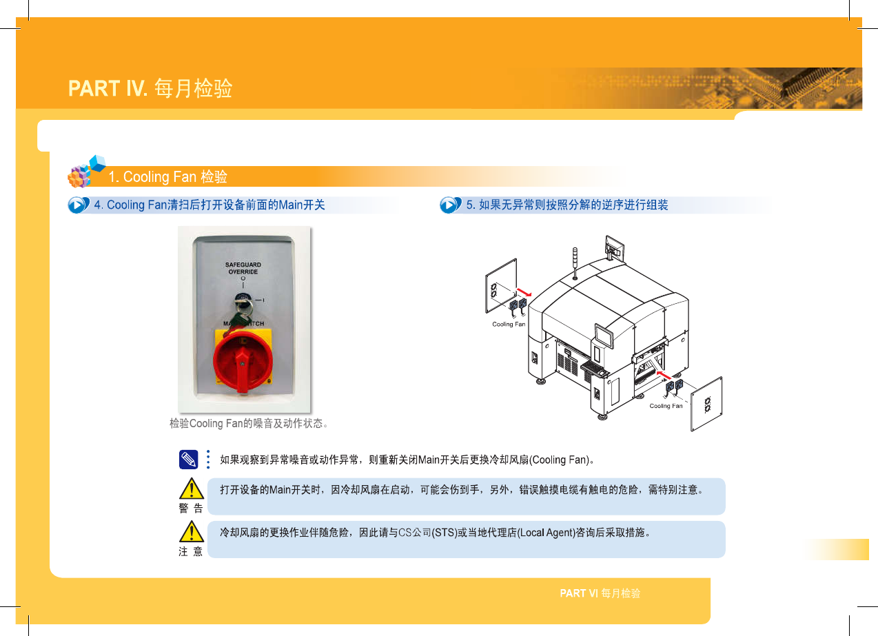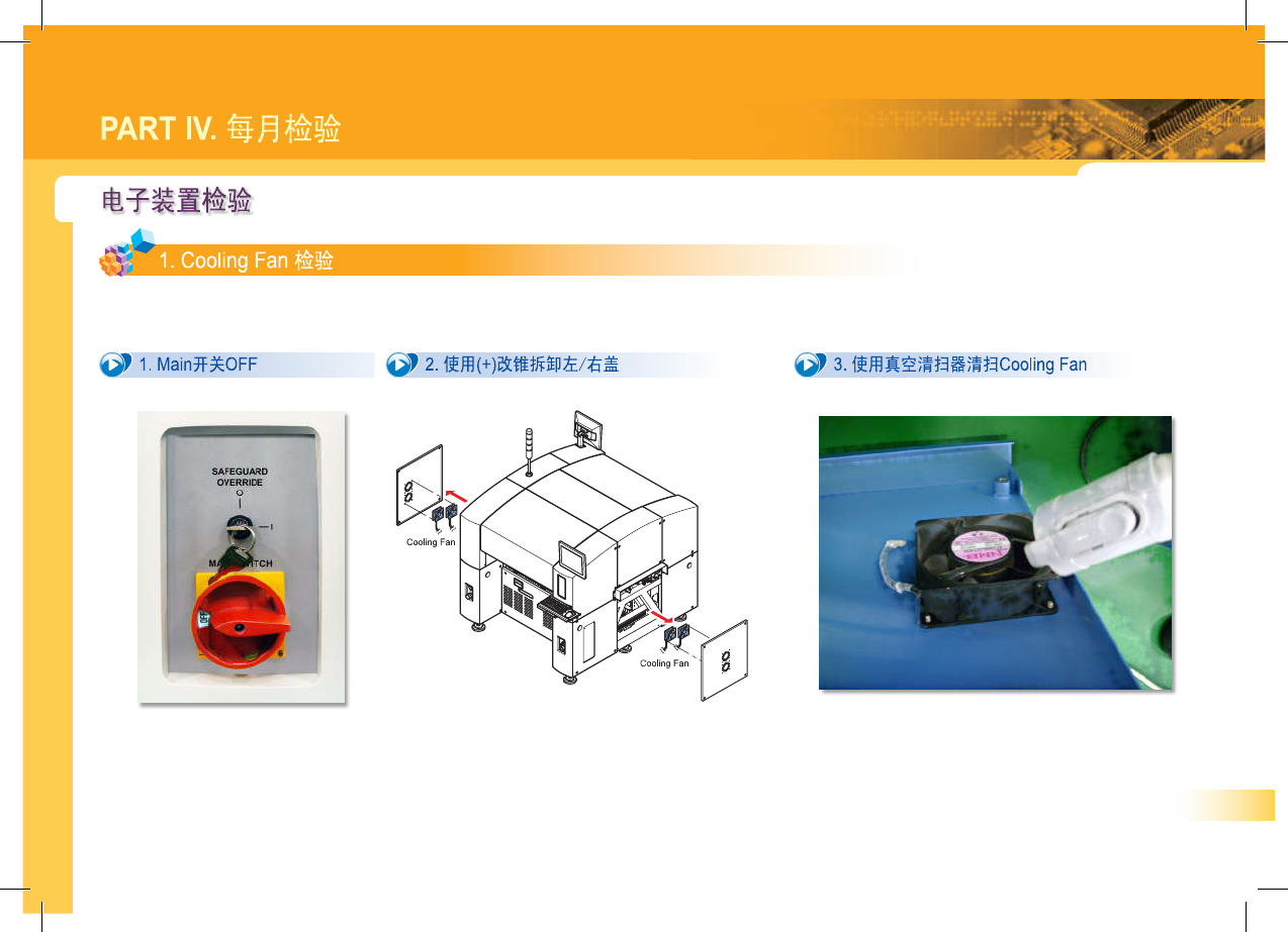 SM 3 10 M ain te na nc e Ha nd bo ok 51 PART IV . 每月检验 1 . Cooling Fan 检验 y 4 . Cooling Fan 清扫后打开设备前面的 Main 开关 & 5 . 如果无异常则按照分解的逆序进行组装 检验 Cooling Fan 的噪音及动作状态 。 驪 i 如果观察到异常噪音或动作异常 , 则重新关闭 Main 开关后更换冷却风扇 ( Cooling Fan…