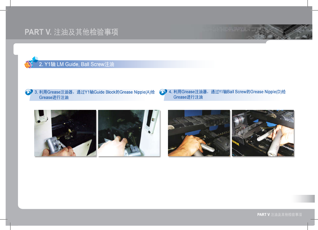 SM 3 10 M ain te na nc e Ha nd bo ok 58 A A D PART V . 注油及其他检验事项 2 . Y 1 轴 LM Guide , Ball Screw 注油 1 . Front / Rear X - Frame Assembly 的背面移动 请参考 < PARTI > K ‘ 维修前共同执行步骤 ’ 中 ‘ Front / RearX - Frame Assembly 的背面移动 ’…