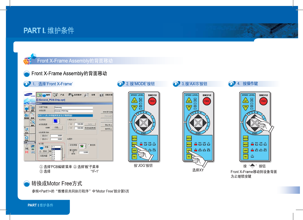 SM 31 0 Ma in te na nc e Ha nd bo ok 6 Front X-Frame Assembly 正面移动 1 2 <6. 示教 > 领域的装置中 1 2 3 PART I . 维护条件 ^ Front X - Frame Assembly 正面移动 这 1 . ^ 2 . ^ 3 . 按操作键 选择 ’ Front X - Frame ' 按 ‘ MODE ’ 按钮 按 ‘ AXIS ’…