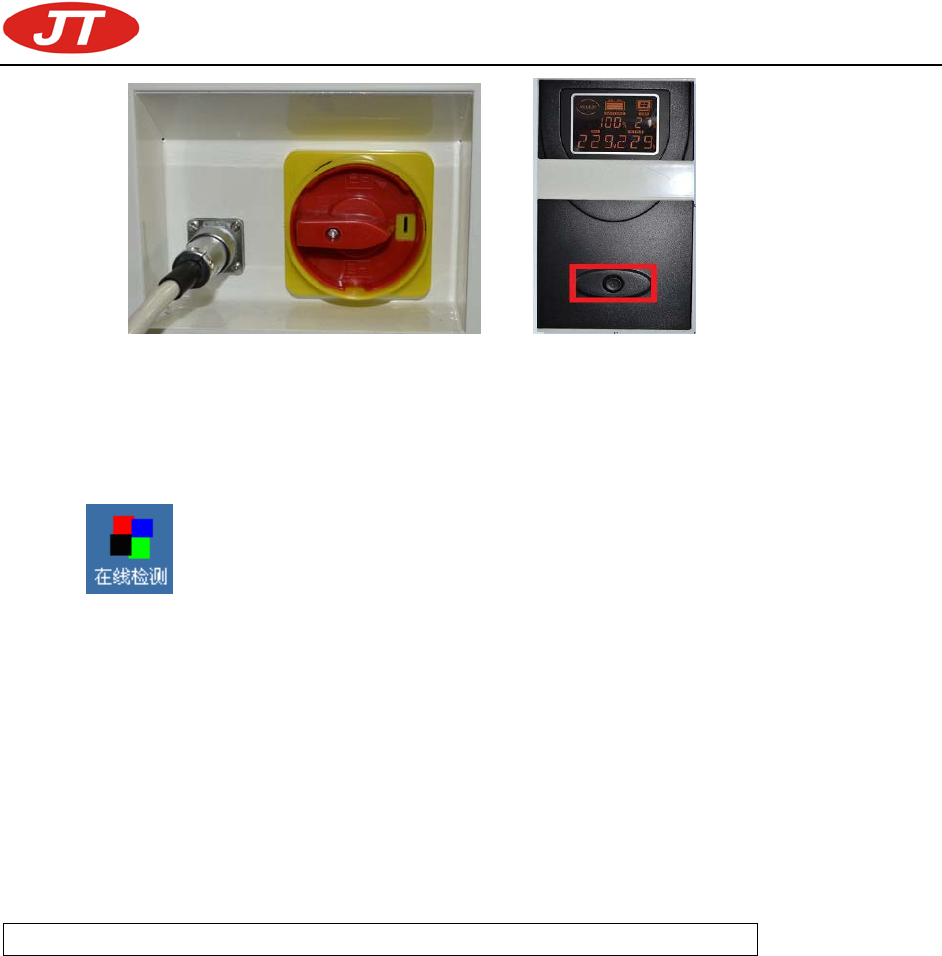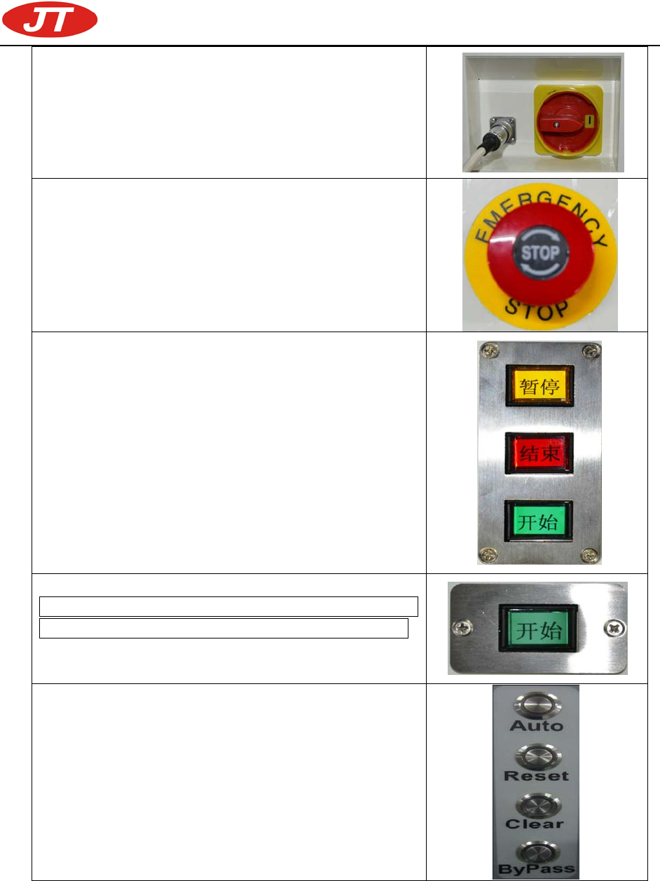 深圳市劲拓自动化设备股份有限公司 (培训资料) - 9- 设备侧方的总电源开关 : 当旋钮处于水平状态表示开 启,逆时针旋转 90 °则设备的所有电源关闭。 操作台面的紧急开关 : 在紧急情况下, 要求紧急停止 时,请按下【紧急停止】开关关闭电源,停止运作。 按下紧急停止按钮后机器状态: 所有马达负载及所有 电源供给被切断。 操作开关 : 左侧的绿色的开关与右侧的绿色开关为上 板测试开关。 红色开关为退板停止开关。 黄色开关为 暂停测试…