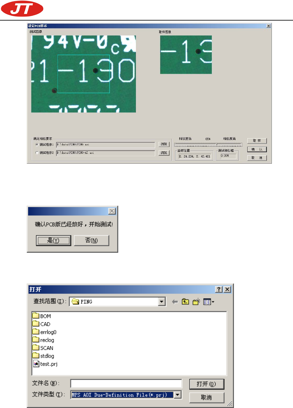 深圳市劲拓自动化设备股份有限公司 (培训资料) - 106 - 4 、在弹出对话框里面,将 “测试程序 1 ”指向路径 TOP 面的程序,并调整左上方的蓝色框体框住 标识, 点击 “取样” , 并设置好相似度值。 再将 “测试程序 2 ” 指向路径为 BOT 面的程序, 然后点击 “确 认”退出。 5 、点击“在线测试”模块中“编辑”文件下面的“验证 PCB ” ,弹出如下对话框: 点击 “是” , 随后在弹出的对话框里验证标识是否可以…
