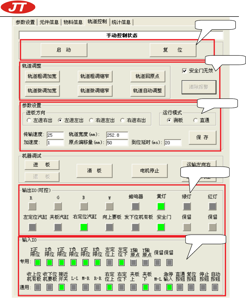深圳市劲拓自动化设备股份有限公司 (培训资料) - 13 - 运行模式调整 轨道宽度调整 轨道参数调整 各部位手动控制 IO 信号显示