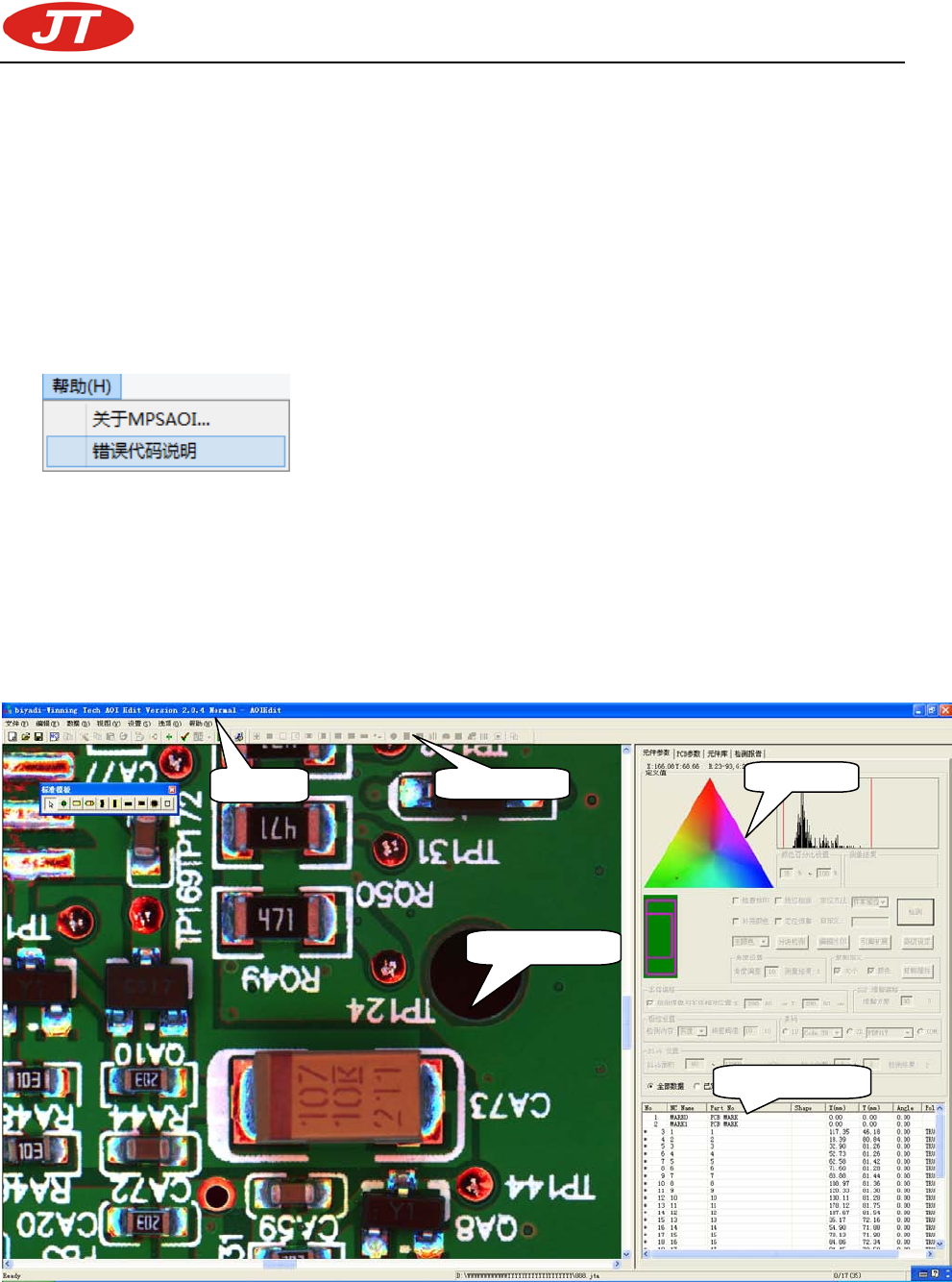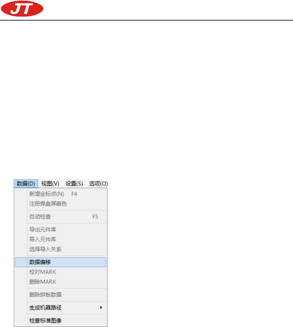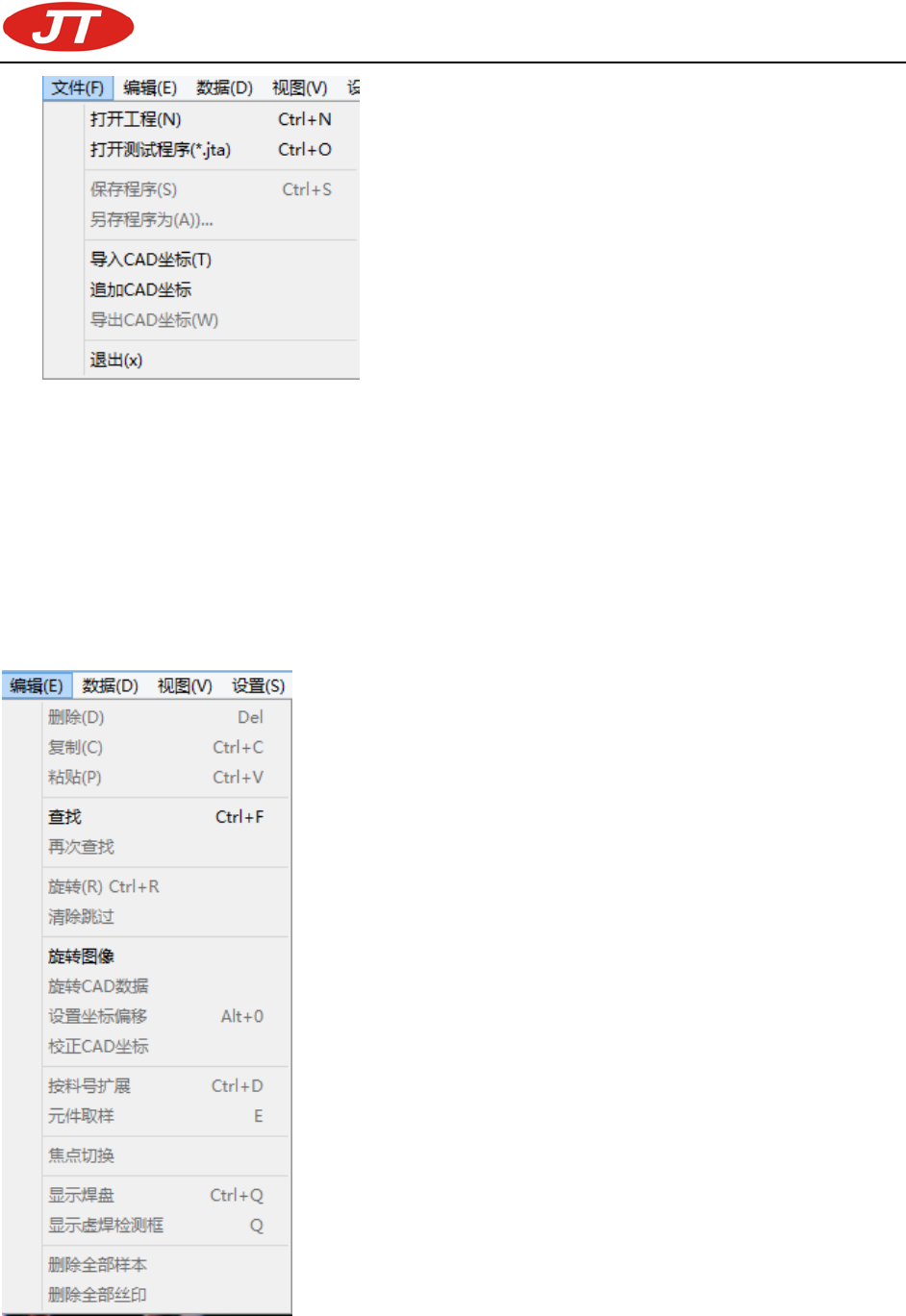 深圳市劲拓自动化设备股份有限公司 (培训资料) - 23 - 打开工程:打开要编辑的文件夹,自动导入里面的图片信息; 打开测试程序:调用该项目已制作好的测试程序,提供编辑或查看; 保存程序:保存当前工程的当前编程状态为测试程式; 另存程序为:另存当前工程的当前编程状态为非系统自动产生的另一文件; 导入 CAD 坐标:导入 PCB 的坐标文件; 追加 CAD 坐标:当有多个坐标文件时,按此功能追加 PCB 的坐标文件; 导出 CAD 坐标…