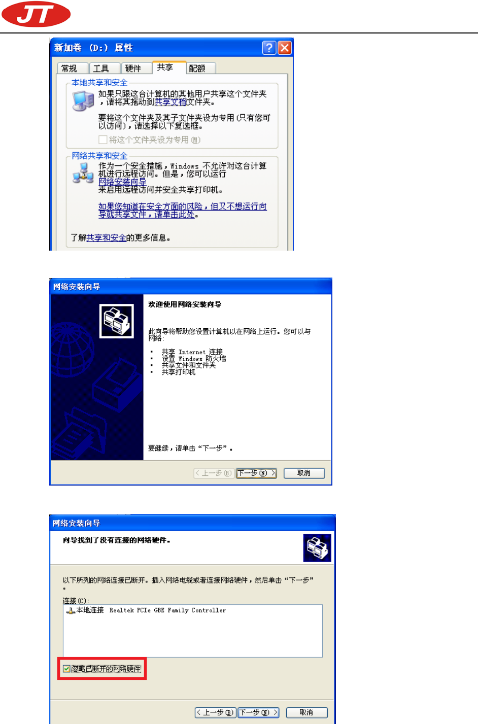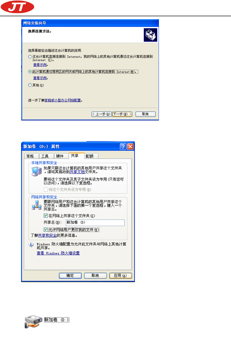 深圳市劲拓自动化设备股份有限公司 (培训资料) - 58 - 八、此时选 择上图中的第二个选项, 再点击“ 下一步” 直至出现 “完成该向导 … ” 的选择后 , 选择“完 成该向导 ... ” ,点击“下一步”会出现安装完成的提示,点击“完成”会出现下图: 十、 在上图中的 “在网络上共享这个文件夹” 和下面的 “允许网络用户更改我的文件” 前面的空格中打 钩选择,并点击“应用” “确定” ,硬盘共享结束,共享成功 后 , 硬盘盘符下…