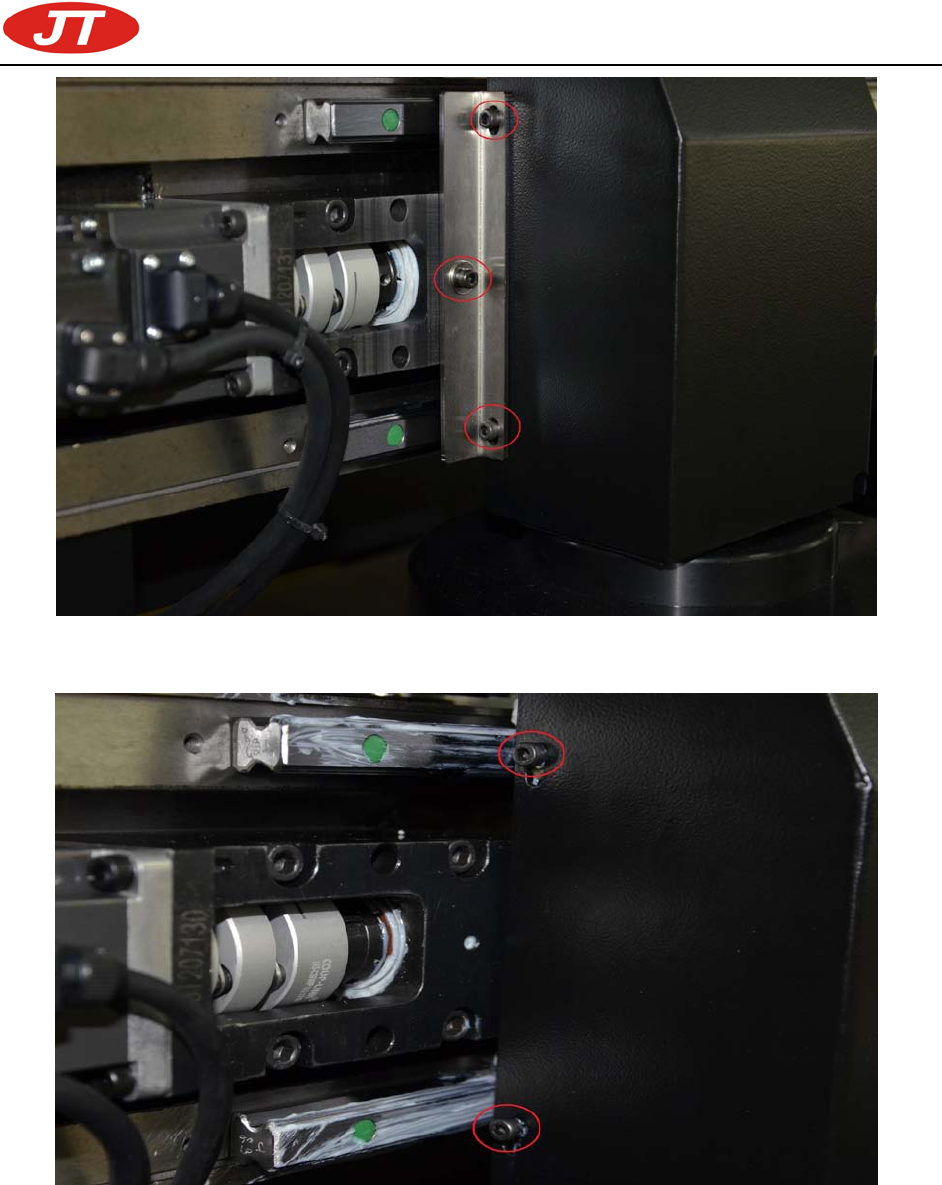1.2 找到 X 轴,然后在它的左侧找到并拆除下图中红圈所指示的 3 处螺钉,取下该不锈钢零件,如下图: