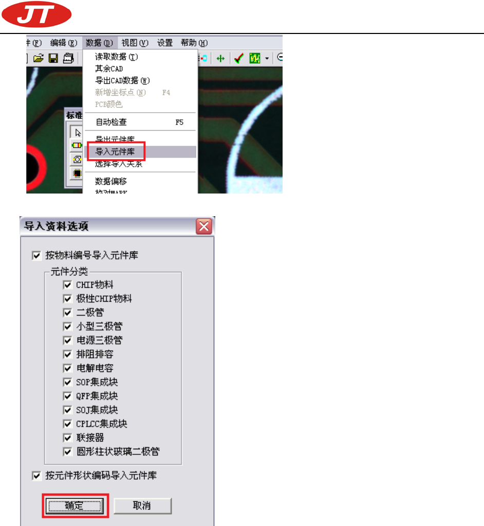 深圳市劲拓自动化设备股份有限公司 (培训资料) - 76 - 第二步、点击“导入元件库“选项后,系统会弹出对话框,选择需要导入的元件定义类型,如下图: 第三步、系统会读取元件数据库中的数据与坐 标文件中的物料编号进行对比,将保存有的元件 库按 物料编号与坐标位置粘贴到各个未定义的元件上。 第四步、导入元件库后,请确认各元件定义是 否正确,并重新获取样本。没有出现元件定义的 坐标 位置请单独制作元件检测定义。 五、备注: 1 、 请选择测…