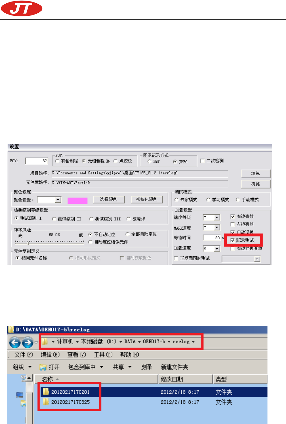 深圳市劲拓自动化设备股份有限公司 (培训资料) - 82 - 附录 6 :记录测试功能使用方法 一、 功能说明: 劲拓 AOI 提 供一个“记录测试”的功能,主要是为了帮助客户在出现漏测或在程序上需要帮助的 时候,可以用记录测试的方法,将当前 PCB 的每一步的测试情况用图片加测试程式的方式,让资料完 整的保存下来,并提供给劲拓的 AOI 售后服务部 ,以便我们详细了解当时的测试情况,并在程式方面 给于修改或指导。 二、使用方法: 1 …