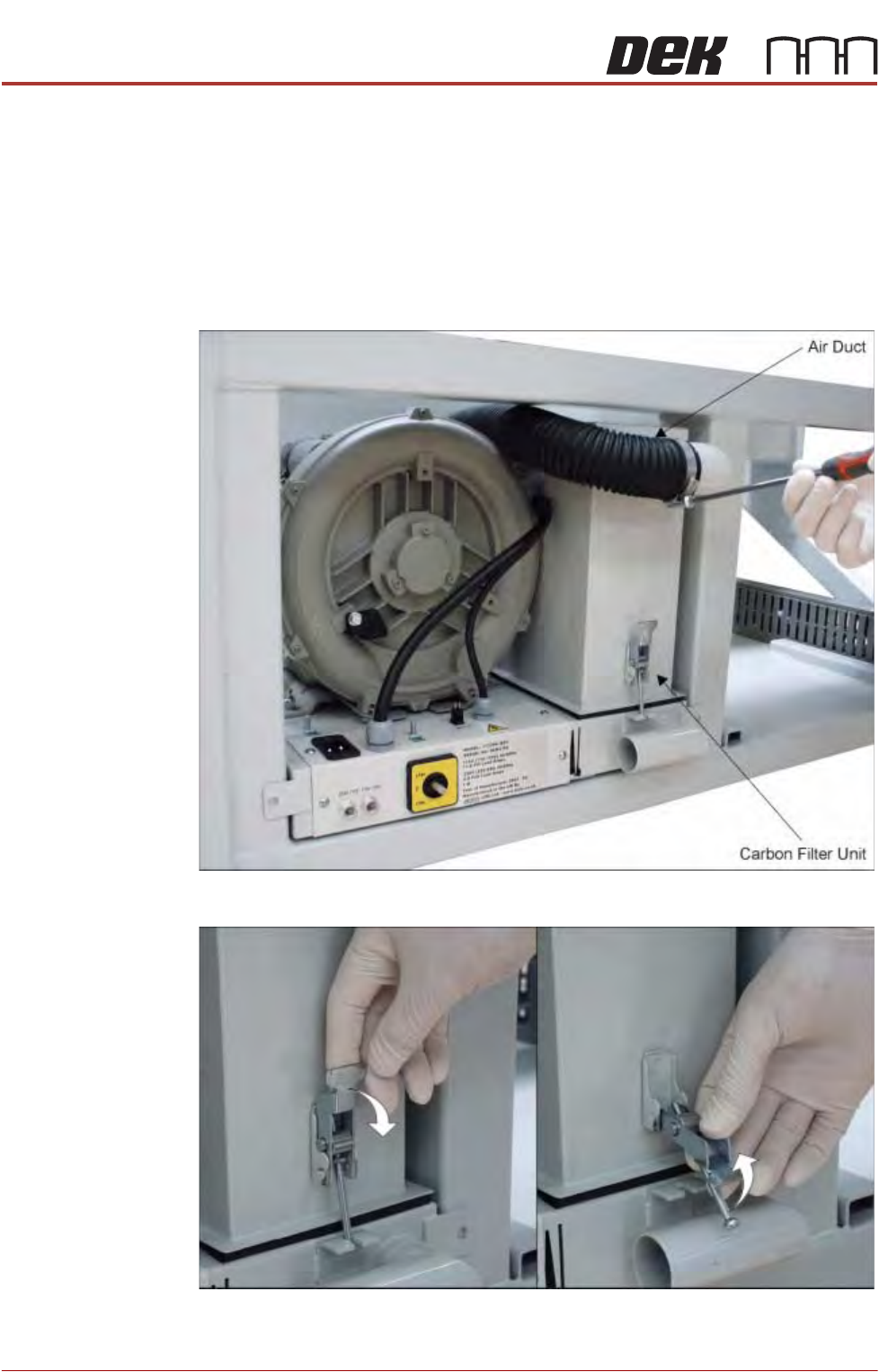 13.Refit and secure the air duct to the carbon filter unit.