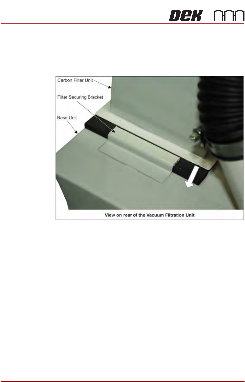 7. The back of the carbon filter unit is secured beneath a filter securing bracket.