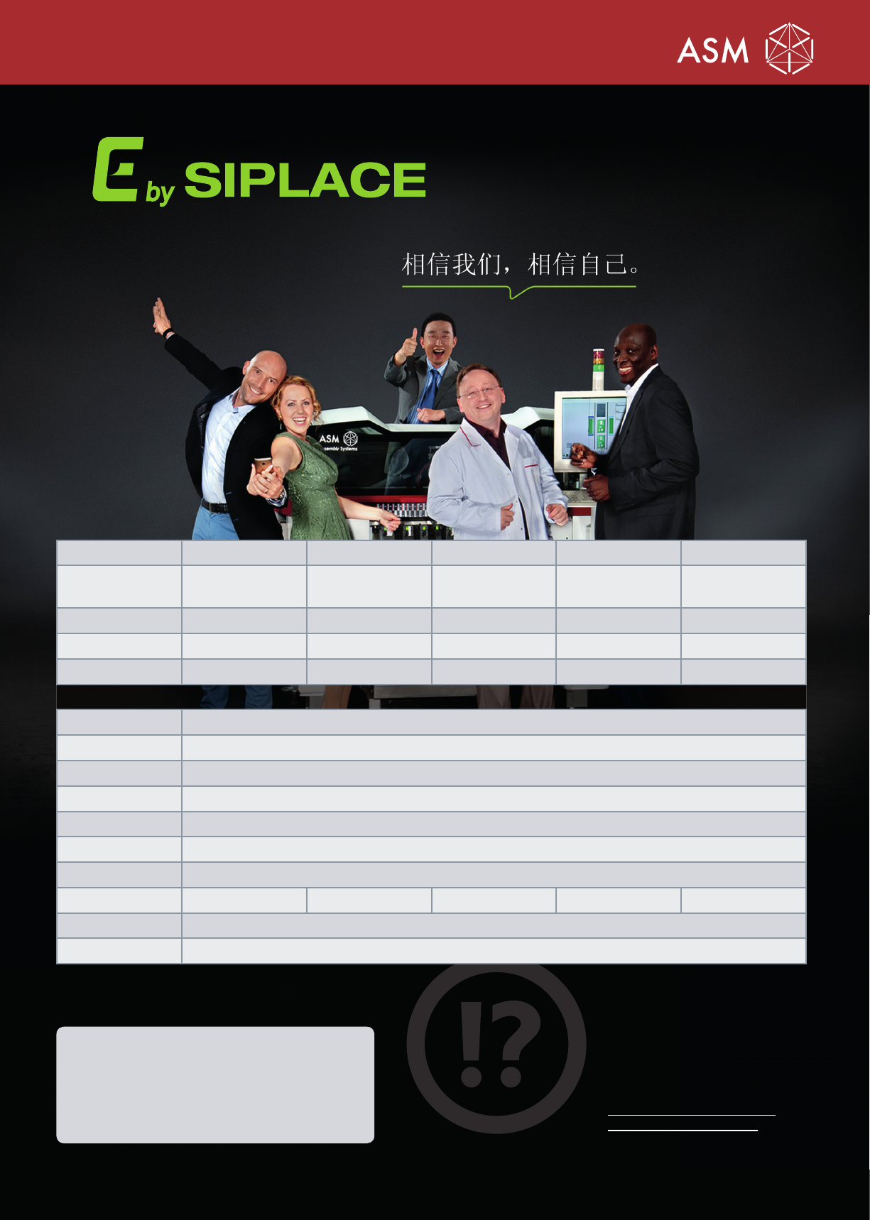 此说明书中所指信息仅包含一般性描述以及/或是性能特点,不具备合同效力。任何详细性能特点/功能均以所签合同为准。如有改动,恕不另行通知。 ASM Assembly Systems Ltd. 拥有对本说明书的最终解释权。 E- 事实 A1001 1-ASM-A75-CN E- 联系信息 我们的目标:为中速机市场提供最好的贴装方案, 并与您一起建立一个强大的 E- 社区 。相信我们, 相信自己!我们期待听到您的声音。 E-Contact: E…