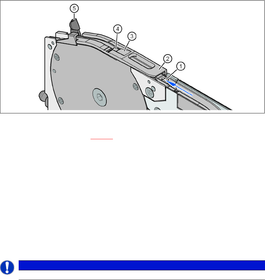5 贴片机上的作业 《用户手册》 E by SIPLACE 5.11 设置供料器模块 使用软件版本 SC 709.1 或更新 年 11 月版 01/2017 234 步骤 2 5 5 图 5.11 - 5 供 料器模块上的拾取窗口 (1) 料带支撑件,可拆卸 (见第 5.11.4.4 节,第 236 页) (2) 拾取窗口 (3) 盖箔的移除边缘 (4) 元件拾取区域 (5) 抬升和锁定拾取窗口的控制杆 将料带的起始端导入拾取窗口 …