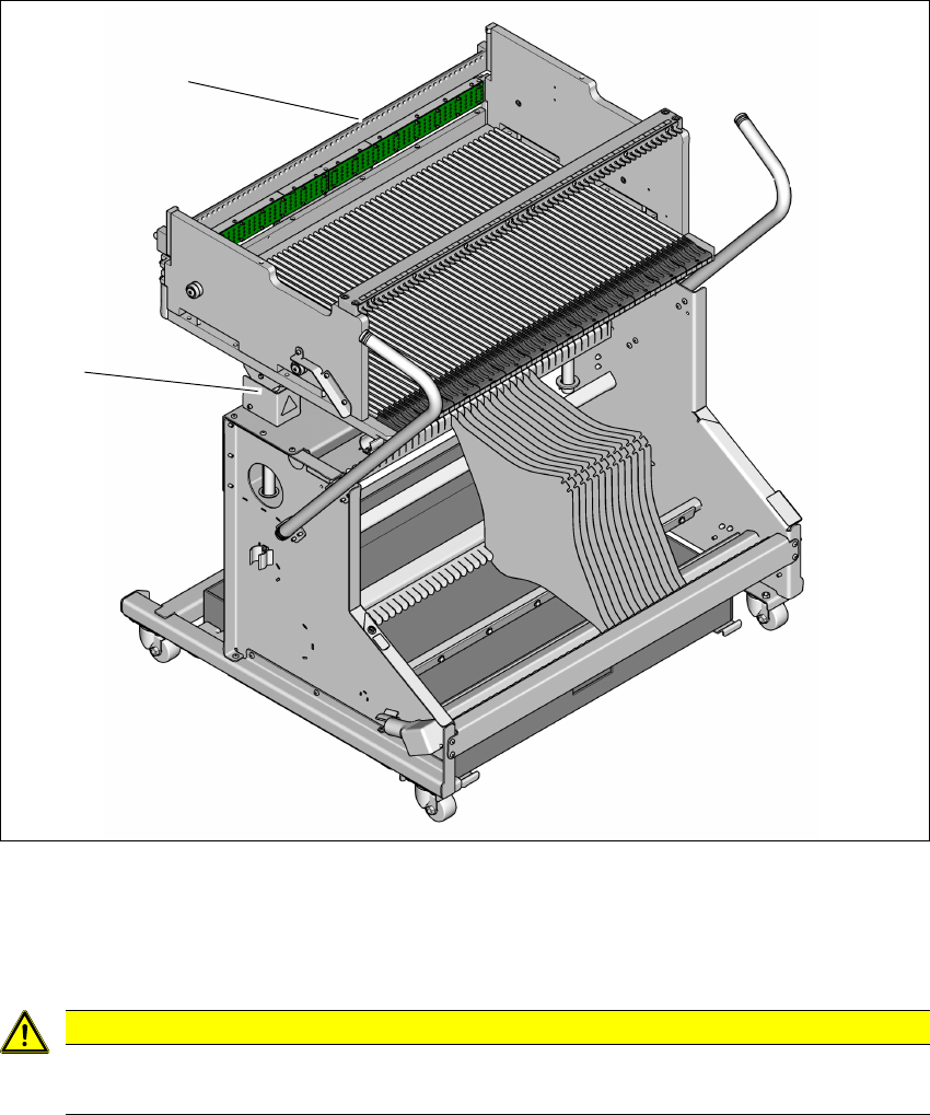 《用户手册》 E by SIPLACE 5 贴片机上的作业 使用软件版本 SC 709.1 或更新 年 11 月版 01/2017 5.16 转换料台入坞或出坞 247 5.16.4 转换料台入坞或出坞 5 图 5.16 - 3 转换料台入坞或出坞 (1) 对中 杆 (2) 将高度设置为贴片机高 度 5 注意事项 推入转换料台! 将转换料台推入贴片机中时,确 保您没有使对中杆撞击到其他障碍 物。 (2) (1)