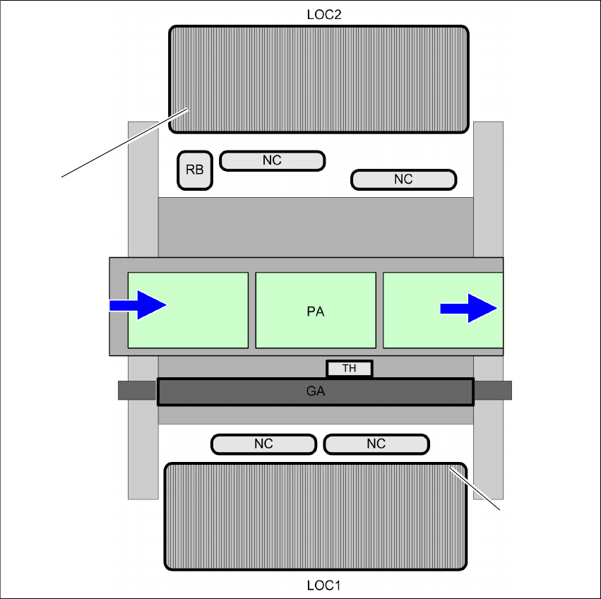 6 贴片机扩展部件 《用户手册》 E by SIPLACE 6.1 吸嘴交换器 使用软件版本 SC 709.1 或更新 年 11 月版 01/2017 260 6.1.2.3 SIPLACE TH 吸嘴交换器的位置 6 图 6.1 - 8 SIPLACE TH 吸嘴交换器的位置 - 示例 6 (1) 1 号料位上的转换料台 (2) 2 号料位上的转换料台 (NC) 吸嘴交换器 (RB) 抛料仓 (PA) 贴片区 (GA) 悬臂 (2) …