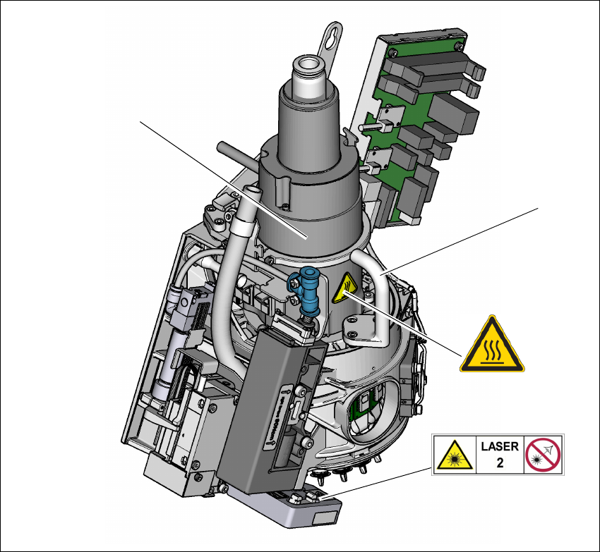 《用户手册》 E by SIPLACE 2 操作安全 使用软件版本 SC 709.1 或更新 年 11 月版 01/2017 2.2 警告标签 57 2.2.5 SIPLACE Spe edStar C&P14 上的警告标签 2 图 2.2 - 11 SIPLACE SpeedStar C &P14 上的警告标签 (1) 高温标签,项目编号:030 31926-01 (2) 星形轴马达外壳 (3) 握柄 W 二级激光,项…