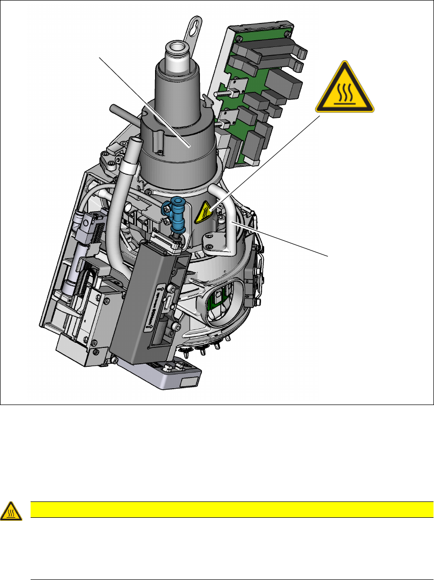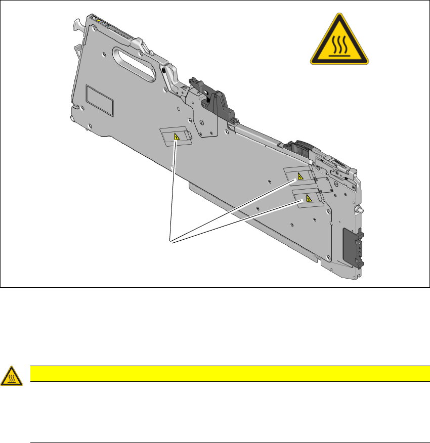 《用户手册》 E by SIPLACE 2 操作安全 使用软件版本 SC 709.1 或更新 年 11 月版 01/2017 2.5 操作贴片机时的安全须知 75 2.5.9 SIPLACE SmartFeeder E 过热 2 图 2.5 - 4 SIPLACE SmartFeeder E 连续运转时会过热 (1) 高温标签,项目编号:030 31926-01 (2) 步进马达 2 注意事项 高温导致烫伤的危险! 在持续工作期间和在温…